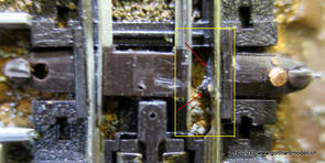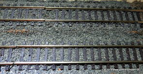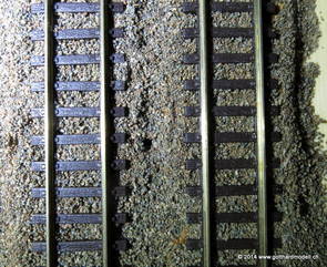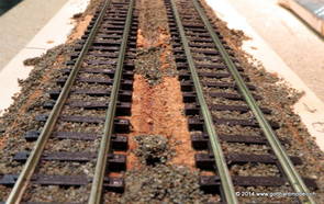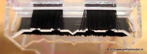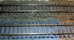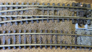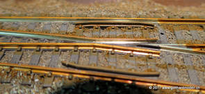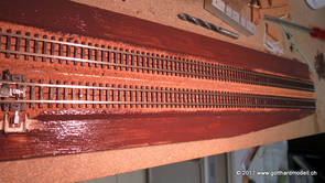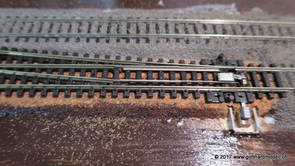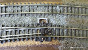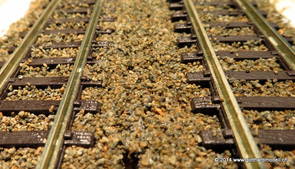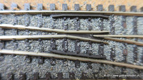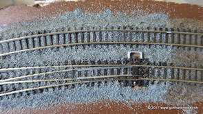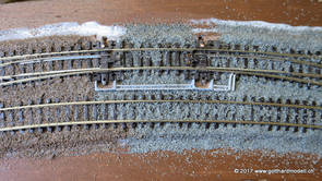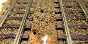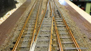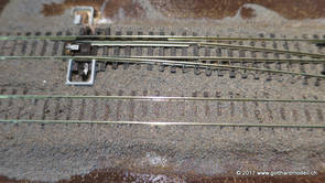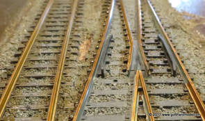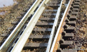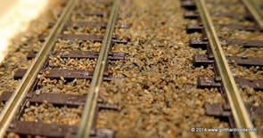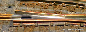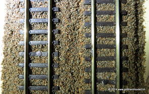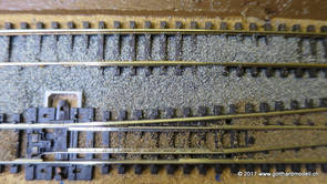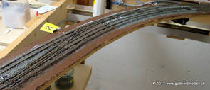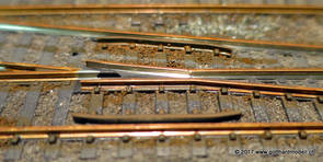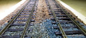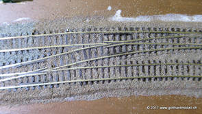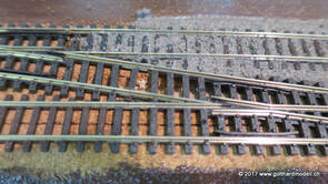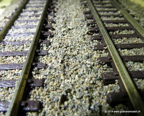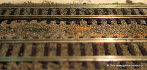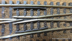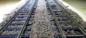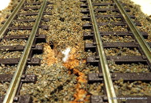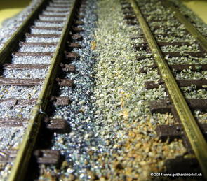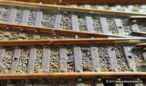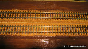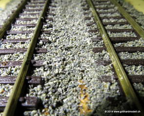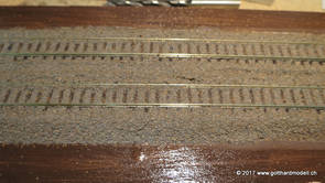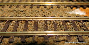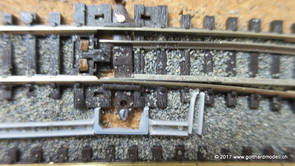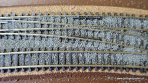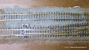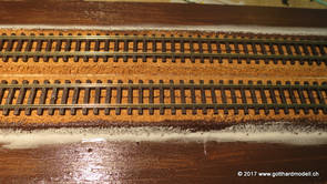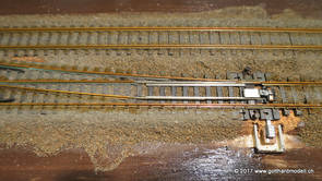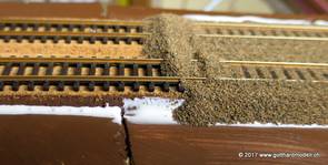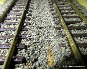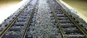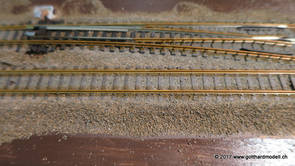 02/18/17 Weichen einschotternLange habe ich mich davor gedrückt (auf der Strecke ist so ziemlich alles eingeschottert ausser den Spurwechseln), jetzt aber komme ich wohl nicht mehr darum herum. Auch hier habe ich ein Probegleis mit zwei Weichen vorbereitet, um mich nicht gleich auf der Anlage zu verschottern. Die Messingbürste kommt auch hier zum Einsatz, bei den Weichenzungen einfach entsprechend vorsichtig und mit "sanftem" Druck. Auf diesen Bildern sind die Radlenker noch vergessen gegangen - wird nachgeholt. 02/19/17 Spurwechsel einschotternBeim Spurwechsel kann weder die Doppelspur- noch die Einspur-Schottervorrichtung verwendet werden - hier habe ich folgendes Vorgehen gewählt: