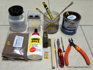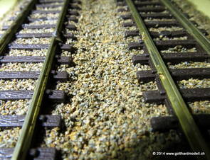 Ebenfalls soll das Einschottern von Gleisen mit Gleisüberhöhung getestet werden - mal sehen, wohin es den Schotter zieht. Hier die Bilder der ersten Versuche: 09/09/15 SchotterhilfeIm Internet habe ich eine Vorrichtung gefunden, die das Einschottern vereinfachen soll - und dies auch für Spur N - sieht ganz interessant aus; doch leider nur für einspurige Strecken verfügbar. Daraufhin habe ich den Händler angeschrieben, wie es denn mit einer Doppelspur aussehe - leider nein war die Antwort ... Zufälligerweise habe ich dann den Hersteller des Gerätes ausfindig machen können, auch ihn habe ich angeschrieben - einen Tag später hatte er einen Doppelspurvorrichtung mit 26.5mm Gleisabstand Peco Code55 mit Bahndamm (also quasi die "Gotthard-Version") im Angebot - wow! Eine Woche später habe ich die Vorrichtung bei mir zu Hause, den Bausatz zusammen gesetzt und er macht einen ausgezeichneten Eindruck. Auf meinen Testschotterstrecken und auch auf der Anlage passt das Teil - jetzt muss dann ein erster Schottertest erfolgen. Nachtrag: Da meine Katzen das Gefühl hatten, diese Schotterhilfe sei ihr neues Spielzeug, fiel das Ganze vom Küchentisch und - wen wundert's? - genau die Böschungskante ist abgebrochen. Und was macht der Hersteller? Sendet mit kostenlos und portofrei Ersatz zu! 02/16/17 Einschottern - die Gotthard-MethodeHier mein Vorgehen zum Einschottern der Doppelspurgleise - vielleicht kannst Du etwas davon für Dich gebrauchen: Material: