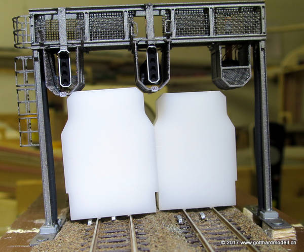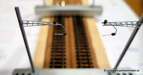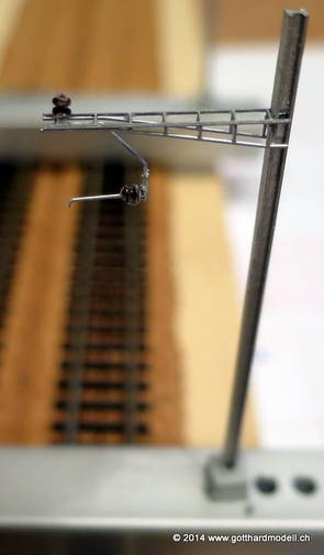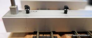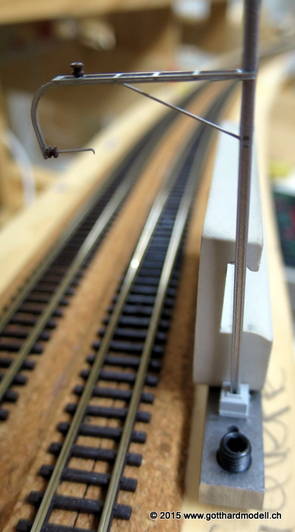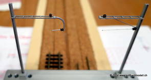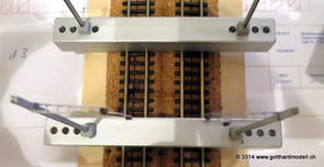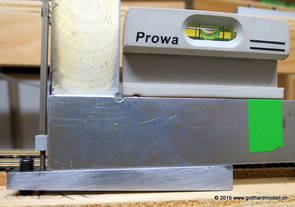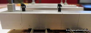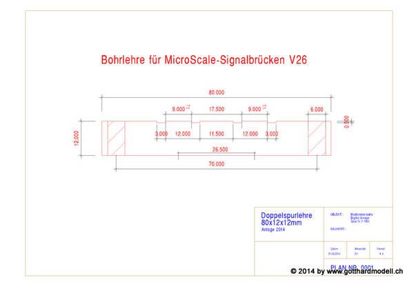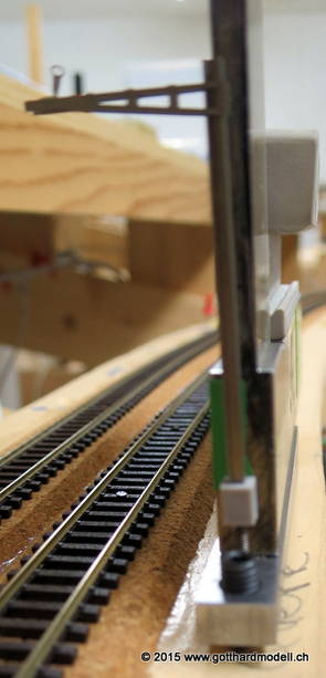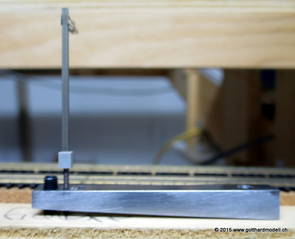 Parallelgleislehre![]() Zum genauen Verlegen der Doppelspurgleise hab ich mir eine Lehre aus Aluminium gefräst, welche in die Gleise eingelegt werden kann und genau den Parallelgleisabstand von 26.5mm ergibt. Für Spezialfälle gibt's noch eine verstellbare Variante. ![]() Auf diesem Bild ist die niedrige Schienenhöhe des PECO Code 55 Profiles gut zu erkennen; dadurch, dass der Schienenfuss in der Schwelle eingelassen ist ragt das Profil nur noch 1.4mm aus der Schwelle heraus. Einziges Zugeständnis an diese niedrige Profilhöhe sind die Kleineisenimitationen auf der Innenseite der Schiene. Ein weiterer Vorteil dieses Systems ist das Verlegen der Flexgleise in Kurven: Federn andere Produkte sofort wieder in ihre "Normalposition" zurück, behalten die PECO Gleise den vorgegebenen Radius und lassen sich besser verlegen - Flexgleisspanner werden so fast überflüssig. Das Bild zeigt das PECO Code 55 Gleis mit eingelegter Parallelgleislehre. 05/23/14 Position der SignalbrückenAlle Signalbrücken werden nun gemäss den letzten Zeichnungen auf der Anlage «positioniert» und es werden die benötigten Bohrungen gemacht und mit 6mm Dübeln auch gleich «markiert», dies hilft, Konflikte unter dem Trassee zu vermeiden (die Position ist von unten und von oben auch ohne montierte Signalbrücke sichtbar). Um diese Bohrung genau fluchtend zur Gleislage zu erstellen habe ich mir eine Bohrschablone angefertigt. 05/23/14 Position der Oberleitungsmasten11/30/14 Alle Gleislehren auf einen BlickHier siehst Du alle Gleislehren (zum Einstellen des Parallelgleisabstandes) und zusätzlich mit den Bohrungen im richtigen Abstand von der Gleismitte für
