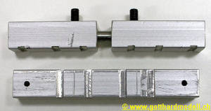 ![]() Zirkel aus 8mm Aluminiumstange, vorne ein M4-Gewinde mit einer spitzen Madenschraube (als Zirkelspitze), hinten ein Aluminiumgleitteil mit zwei um 90° versetzten Bohrungen, welche ebenfalls mit M4 Madenschrauben gesichert werden. Dort wird auch der Bleistift eingesetzt. Korkgleisbettungen
