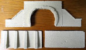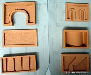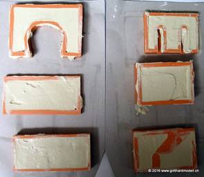 12/29/16 Tunnelportal, Stützmauer, Arkade usw.Im Internet habe ich diese Silikonformen zu erschwinglichen Preisen gefunden (das Teurste war wohl wieder mal der Schweizer Zoll) und gleich alle für mich in Frage kommenden Formen bestellt - und heute sind diese angekommen. Natürlich musste ich gleich mit allen Formen mal einen Probeabguss machen - die Resultate folgen. Das Tunnelportal entspricht übrigens ziemlich gut der NEM105, was ich vor der Bestellung mit dem Hersteller abgeklärt habe. 12/30/16 Die ersten Abgüsse |
