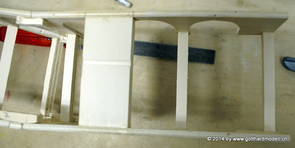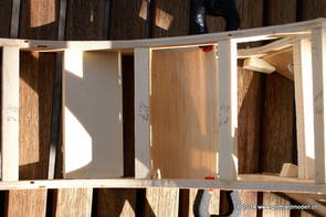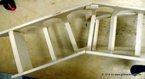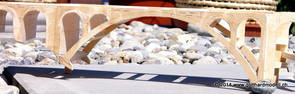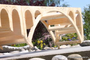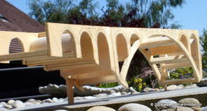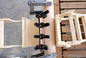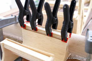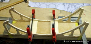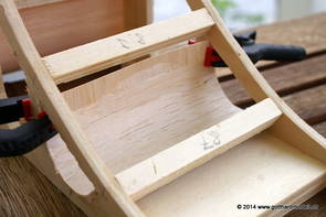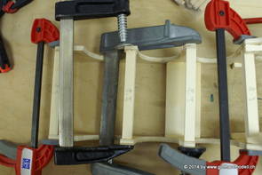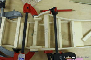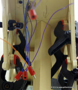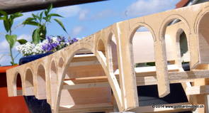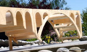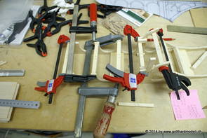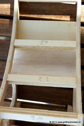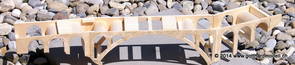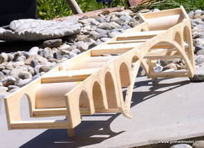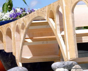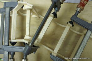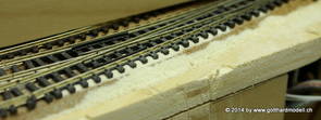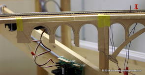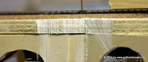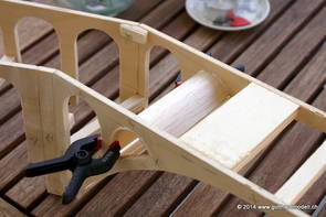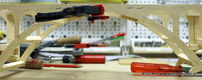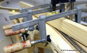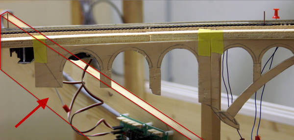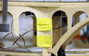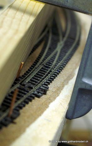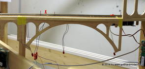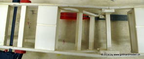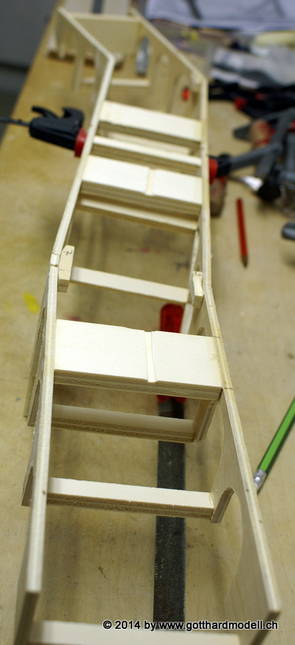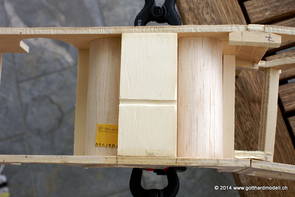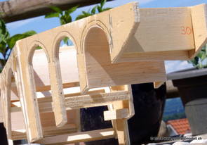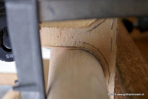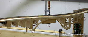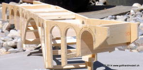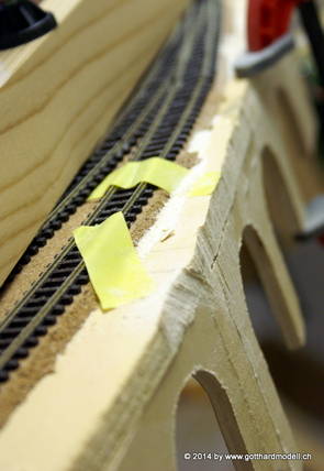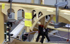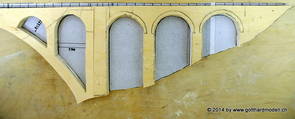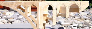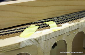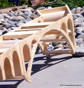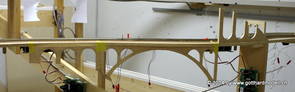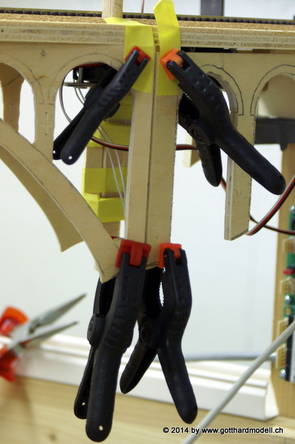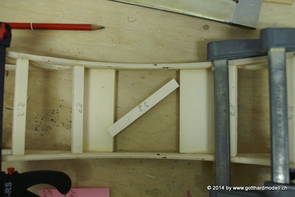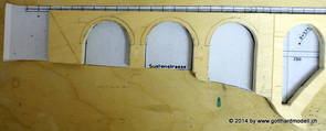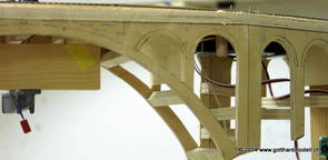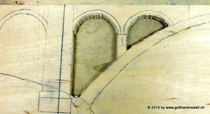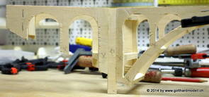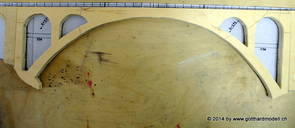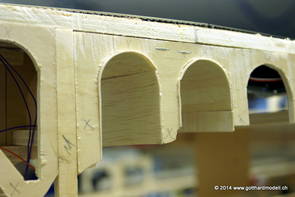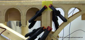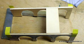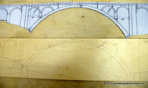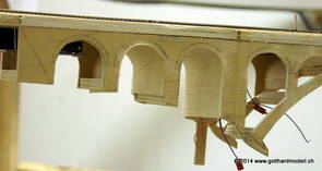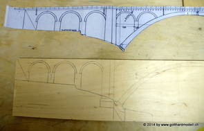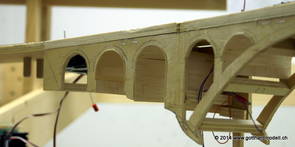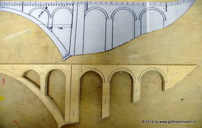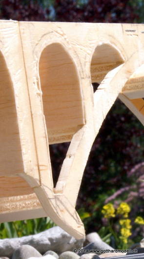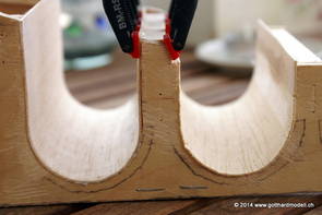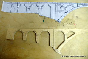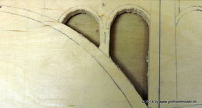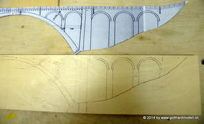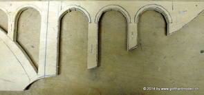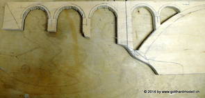 Die Decoder wurden nun auch schon an der definitiven Position befestigt - bevor aber die Verdrahtung in Angriff genommen werden kann muss die Meienreussbrücke erstellt werden. Da diese genau über bzw. unter den Servos und dem Antriebsgestänge zu liegen kommt muss sie für spätere Wartungszwecke abnehmbar sein - das alleine ginge ja noch, aber die Brücke liegt zusätzlich auch gerade noch in einer S-Kurve - also nichts mit einfachem, geraden Brückenbau. Die Kontur der Brücke wurde auf 5mm Sperrholz übertragen - und jetzt stellte sich eigentlich die alles entscheidende Frage: Soll das Sperrholz gebogen (also dem Trassee anpassen) oder in Einzelteile «zerlegt» werden? Diese Frage hat mich einige Tage lang beschäftigt; ein Versuch mit 4mm Balsaholz fiel nicht gerade überzeugend aus. Die Ausführung des Brückenbaukurses von «stivaretica» im Albulamodellforum haben mich dann dazu bewogen, die Brücke in drei Teile zu zerlegen (und auch das Trassee, dort wo es übersteht, abzusägen) und so dem Streckenverlauf anzupassen. 18.05.2014 Nun ging's an Aussägen - Bogen für Bogen wurde in Anfriff genommen, und am Schluss kam dann noch die Feile zum Einsatz. Anschliessend wurde die Brücke dann in die drei Teile zerlegt. 20.05.2014 Beim Entfernen des Lehrgerüstes habe ich festgestellt, dass dies wegen der Geländestütze (rote Markierungen) und der Auflage für die Brücke ziemlich umständlich vonstatten geht. Aus diesem Grund wurde die Geländestütze nach links versetzt, so dass sie ausserhalb des Brückenbereiches zu liegen kommt. Das bedeutet natürlich, dass der Weichendecoder wieder entfernt und umpositioniert werden muss, dass die Trasseenauflagen versetzt werden müssen, auch dass die Trassee an bestimmten Stellen verstärkt werden muss (wegen Durchhänggefahr) und und und ... 21.05.2014 Das Entfernen («wegmeisseln») der Trasseeverbindung unter der Brücke und auch das Verschieben der Geländestütze haben dazu geführt, dass sich ein Knick gebildet hat - dieser musste mit etwas Gewalt wieder in die Schranken gewiesen werden, da er genau im Brückenbereich lag und ziemlich gut sichtbar war. Und was lernt man daraus? Richtig, schon beim Planen darauf achten, dass das Trassee in Brückenbereichen immer aus einem Stück besteht und nicht zusammengesetzt werden muss - die Stabilität wird es danken! Auch wurden jetzt die «überstehenden» Kanten des Trassees entlang der Brücke weggesägt (von Hand mit einem leeren Sägeblatt; war ganz schön knifflig) und auf der Gegenseite die offenen Stellen mit einem passenden Stück wieder geschlossen; zum Schluss noch mit der Feile die Kanten begradigt. 22.05.2014 Jetzt wurden die «zusätzlichen Querstreben» auf die Länge hergestellt (damit die Seitenwände der Brücke gemäss Viadukt-Normalien einen Anzugswinkel von 1:40 haben) und eingeleimt (ausser wenn ich den Leim vergessen habe, was sich nach dem Lösen der Schraubzwinge sofort bemerkbar gemacht hat) - und so sieht die Baustelle dann aus: 23.05.2014 Einbau der Gewölbewände - dazu habe ich 1mm Balsaholz verwendet; dieses lässt sich ausgezeichnet biegen (aber nur in einer Richtung) so dass die Innenbögen direkt aus einem Stück hergestellt werden können. Die Brücke nimmt immer mehr Formen an, jetzt «fehlen» noch zwei Innenbögen und dann zum Schluss der grosse Bogen - hier die Impressionen. |