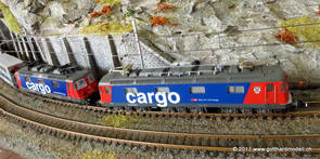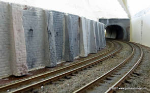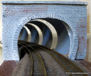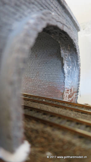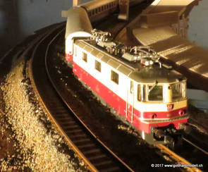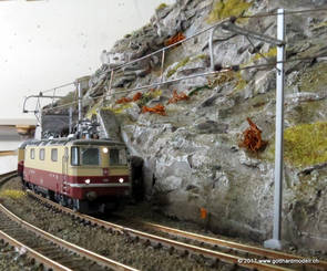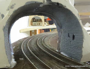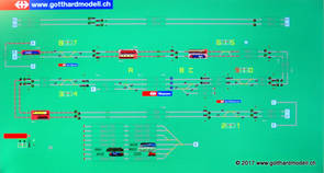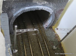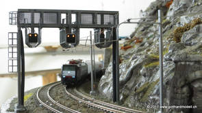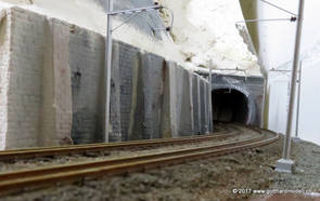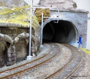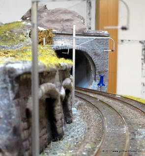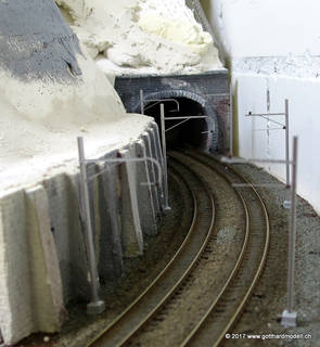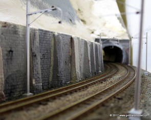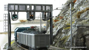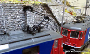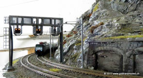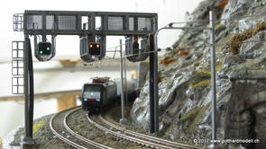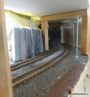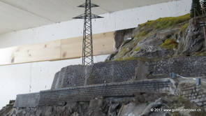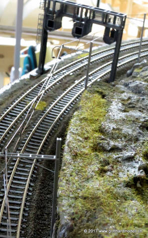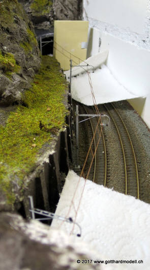 Jetzt aber schalten die Vorsignale wie gewünscht und es sieht genial aus! 08/12/17 Diverse EinstellungenDas Bremsen über mehrere Blöcke hinweg (nordwärts fahrender Zug in Wassen auf Gleis 2 und 22) wurde noch weiter optimiert - die Blocksteuerung «sieht» aufgrund unterschiedlicher Zugfahrten nicht weit genug voraus und das integrierte Blocksignal von Block 22 schaltet einen Moment zu spät auf Fahrt, um den Zug nicht unnötigerweise anzuhalten. Hier habe ich mit geeigneten Auslösern und Bedingungen etwas «nachgeholfen», um den Zug in Block 2 mittels einer «zeitweiligen Geschwindigkeitsbeschränkung» nur dann abzubremsen, wenn es auch wirklich notwendig ist. Gemessen habe ich auch - ein Zug benötigt mit den aktuellen Anfahr- und Geschwindigkeitseinstellungen glatte 8 Minuten für eine komplette Runde; bis alle Züge nach einer Runde wieder stehen geht es 11 Minuten. 08/13/17 Elektrifizierung StrahllochAuch an der am schlechtesten zugänglichen Stelle zwischen dem dem Strahlloch- und dem Leggisteintunnel wurde nun das 100er Gleis elektrifiziert - eine wahre Fummelei ist das - doch sieh selber: