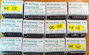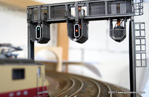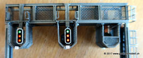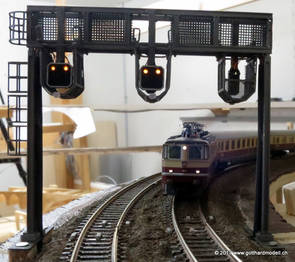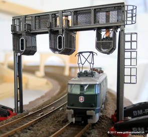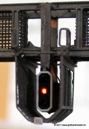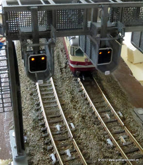 Zwergsignale am Pfaffensprung04/02/17 Lehren und AbnützungHier sind die Lichtraumprofillehren nach 04/03/17 Rückmelder-Verkabelung die DritteWie bereits Also wurden alle Stränge wieder abgehängt und einzeln ausgetestet - Strang No.3 war der «Schuldige» - doch welche Komponente? An diesem Strang ist ein UB63340, ein Blücher GBM16X-8A, zwei Daisys sowie ein Fred angeschlossen - hoffentlich ist keine Komponente defekt! Jede Komponente einzeln für sich mit einem «fliegenden» Kabel getestet und alles funktioniert; d.h. es müsste ein Kabel sein. Die RJ12 Stecker sind alle «richtig herum» angeschlossen - wo liegt der Fehler? Die Lupe brachte es dann zu Tage - bei einem Stecker waren Pin5 und Pin6 zusammen gekrimpt - die Qualitätskontrolle lässt grüssen! Stecker abgeschnitten und einen Neuen (diesmal aber richtig) angeschlossen und schon klappt's auch mit dem LocoNet ;-) Ach ja, fast vergessen - in der Not habe ich schon mal zwei DR5097 10-fach LocoNet-Verteiler von Digikeijs bestellt - diese werden nun für die weiter entfernten LocoNet-Verbraucher (Schattenbahnhof und Bahnhof Göschenen) verwendet ... 04/07/17 Signalbrücke am LeggisteinDiese Signalbrücke habe ich «ausserplanmässig» bestellt, ist aber notwendig, um am Leggistein weiterarbeiten zu können. Damit die Signalbrückenkabel «eingefädelt» werden können muss diese vor dem Geländebau platziert und danach dementsprechend geschützt werden. 04/08/17 Montage Decoder und Signalbrücke04/09/17 Signalbrücke in Betrieb04/10/17 Diverse AnpassungenIm TrainController-Gleisplan wurden alle Signaladressen eingetragen und das Notrot aller Signale fertig definiert - damit auch das Signal in der Software das Notrot anzeigt. Und das sieht dann so aus: