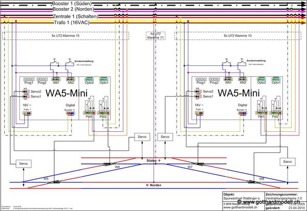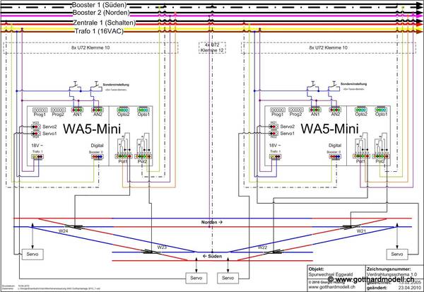 Damit auch später noch nachvollzogen werden kann, was wo angeschlossen ist, zum Beispiel für eine Erweiterung, oder, noch wahrscheinlicher, die Fehlersuche, habe ich mittels Visio alle elektrischen Anschlüsse dokumentiert. So wird auch jede Lüstenklemme mit einer eindeutigen Bezeichnung versehen, welche dann auch wieder auf dem Schema erscheint. Du findest hier die Verdrahtungsschemen der Gotthardnordrampe - vielleicht kannst Du daraus die eine oder andere Anregung verwenden. |
