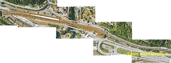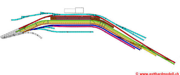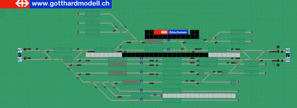 Göschenen und sein BahnhofDer Bahnhof Göschenen liegt auf 1105.9 müM und bildet den nördlichen Abschluss des Gotthardtunnels. Aus der Vogelperspektive sieht das dann so aus: ![]() und die Umsetzung im Modell: ![]() Der dargestellte Abschnitt hat im Original eine Länge von ca. 1000m, im Massstab 1:160 wären dies immer noch um die 6.25m - hier wurde die Länge im Massstab 1:400 nachgebildet und die Krümmung des Bahnhofs etwas verstärkt, so dass das Ganze auch in den Raum passt. Ob und wenn ja wie die MGB miteinbezogen werden kann ist noch nicht definitiv - was aber sicher nicht kommen wird ist der Bahnhofsteil auf der anderen Seite der Göschenenreuss (weisser Gleisanschluss links unten). Insgesamt sind 27 Weichen enthalten, die Gleislängen variieren zwischen 2419mm (Gleis 2) und 183mm (Gleis 8). Die durchschnittliche Länge eines Personenzuges beträgt zwischen 1000 und 1500mm, so finden auch die langen internationalen Züge Platz an den Perrons. Gleis 1 ist für Pendelzüge, 2+3 für SwissExpress, InterRegio, EuroCity, InterCity, Schnellzüge und 4-7 für Güterzüge vorgesehen. Gleis 9 liegt an der Verladerampe, an welcher der Autoverlad stattgefunden hat. Auf der Anlage dient diese Rampe dem Verlad von Armeefahrzeugen. Südwärts fahrende Güterzüge, welche in Erstfeld eine Schiebelok erhalten haben, fahren auf Gleis 3 ein, halten an, die Schiebelok wird abgekuppelt und folgt dem bereits wieder ausfahrenden Zug in gemächlichem Tempo bis zu den Weichenfeldern beim Gotthard Nordportal, wo sie dann umsetzen kann und sich bereit macht für die Rückfahrt nach Erstfeld. Bahnhofsgebäude GöschenenNachdem nun Originalpläne des Bahnhofgebäudes vorliegen kann mit der Umsetzung in den Massstab 1:160 begonnen werden. Die Pläne zeigen das Gebäude im Jahre 1954, welches die stolze Länge von 108.75m hat - das wäre auf der Anlage ein Modell von 68cm Länge - hier wird wohl der Mittelteil etwas gekürzt werden müssen. Stellwerk Göschenen |