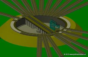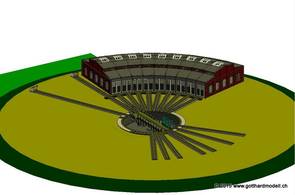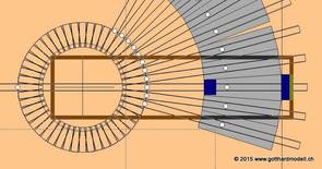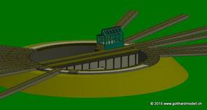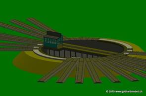 Schauen wir mal was wir da insgesamt verbrochen haben, da wir fast fertig sind. Diese Abbildung (zoom3) verdeutlicht den Platzbedarf. Nachgestellt ist die Situation für "gotthardmodell ch". Die Grube der Flm Drehscheibe ist 25mm tief, was ein Loch in der Grundplatte oder eine Rampe erfordert. Hier wurde alles auf 26mm über Null (nicht über Meeresspiegel) gestellt. Die Gleise werden um 3mm erhöht, sodaß SO auf 29mm kommt. Es ist kein Bausatz. Neun Stände am Stück |