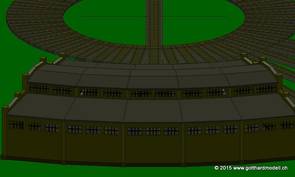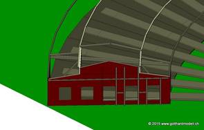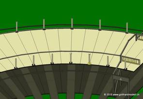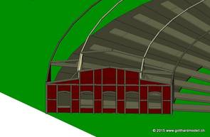 Hier wurden noch die Fe-Bögen von außen eingesetzt. Wenn es außen gut aussieht, paßt es auch innen. Zum Schluß wurden noch die schrägen Dachträger kopiert (Träger vor der Seitenwand), gedreht und positioniert. Damit ist auch die hintere Seitenwand fertig und wird in den anderen Modellordner kopiert |