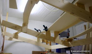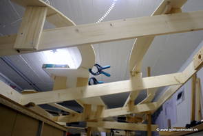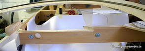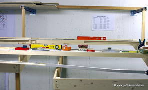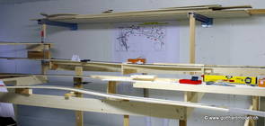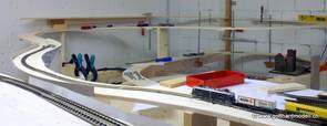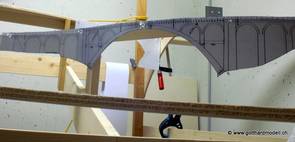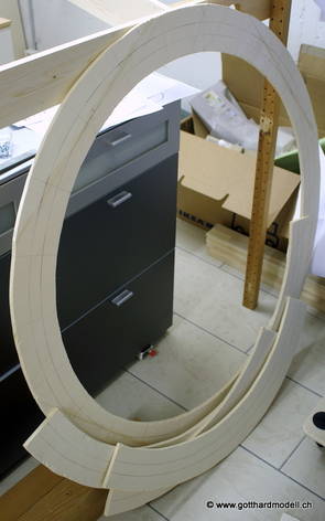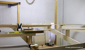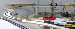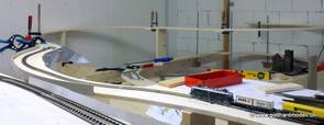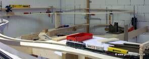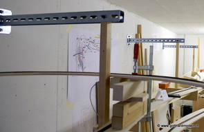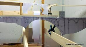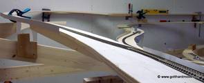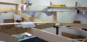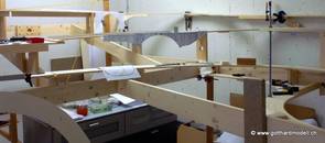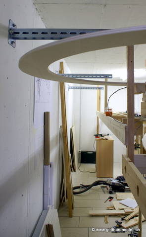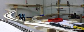 Zuerst musste das Trasse des Leggisteinkehrtunnels und der hintere Teil das "alten" Rahmens demontiert werden, danach konnte die "neue" Verbindung vorne erstellt werden. Anschliessend wurden die Trassenbretter für den Pfaffensprung ausgesägt und platziert, das Trasse für den Leggistein habe ich gestern schon vorbereitet - und die Bretter für den Gleiswendel "Pfaffensprungkehrtunnel" werden gerade jetzt besorgt. 06/23/09 Wendel Pfaffensprung und Leggistein