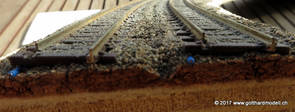 Da nun einige Streckenteile mit Kurven verlegt sind, habe ich im Wattingerkehrtunnel (da sieht man's nicht) erste Versuche mit der Kurvenüberhöhung gemacht. 08/12/09 Erster Versuch: 1.45mm08/13/09 Zweiter Versuch: 0.9mmNach vielen Rückmeldungen im Forum, welche sich mit meinem Eindruck decken (Neigung zu stark) hat Markus den entscheidenden Hinweis gegeben (hätte ich ja selber auch drauf kommen können) - die MOROP Normen, genauer gesagt Mit diesen 0.6mm Querneigung sieht es dann etwas weniger «dramatisch» aus, der Eindruck, wenn sich der Zug neigt ist aber immer noch vorhanden. Erreicht wird die Neigung durch das Einlegen eines U72 Klingeldrahtes, welcher nach dem Einschottern nicht mehr zu sehen sein wird. 02/26/17 KurvenüberhöhungUnd so sieht die Überhöhung nun an der Anlage in eingeschottertem Zustand aus - 8 Jahre nach den ersten Versuchen notabene ;-) |
