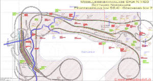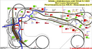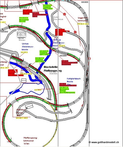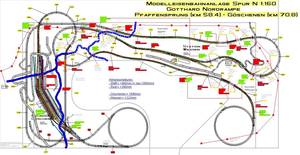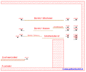 Nachdem definitiv feststand, dass wir im Jahr 2007 nochmals umziehen werden und dann ein Hobbyraum mit den Massen 7.32x3.96m zur Verfügung stehen wird, wurde natürlich sofort mit der Planung begonnen - doch was sollte geplant werden? Ein Anlagenthema musste her, das folgende Kriterien erfüllte: - Bezug zur SBB Mit diesen Vorgaben standen eigentlich nur zwei Themen zur Auswahl: Die Gotthardnord- und die -südrampe. Die Entscheidung für die Nordrampe war dann ein Bauchentschluss; nicht zuletzt wegen den Kehrschleifen bei Wassen. Jetzt konnte auch mit der Planung begonnen werden. Zuerst wurde im Internet abgegrast, was verfügbar war, die SBB mit "Bettelbriefen" um Pläne der Strecken angegangen, Kollegen erstellten Bilder und und und ... Nachdem die ersten Pläne der SBB mit dem Originalstreckenverlauf der Nordrampe eingetroffen waren, war schnell klar, dass nur ein Teil der Nordrampe realisiert werden kann - doch welcher? Wieder waren die beiden Kehrschleifen bei Wassen ausschlaggebend, aber wie weit nach Norden und nach Süden? Auf der zur Verfügung stehenden Fläche konnte im Norden bis zum Pfaffensprung-Kehrtunnel und im Süden bis zum Gotthard-Nordportal geplant werden; dies beinhaltet auch den Bahnhof Göschenen, welcher dann der "grössere" Bahnhof ist. Mit der Gleisplanungssoftware (ich verwende WinRail von Gunnar Blumert) wurden Gleispläne erstellt, dass der Bildschirm rauchte - eine Version jagte die andere. Mit Hilfe der Forumskollegen wurde der Gleisplan immer mehr verfeinert und auch verbessert, bis die heutige Version entstanden ist - es ist mittlerweile Version 66. Die Anlage wird so im Raum platziert, dass rund um die Anlage ein Servicegang von mindestens 60cm Breite vorhanden ist, welcher die Zugänglichkeit auch von der Anlagenrückseite gewährleistet. Zuschauer können durch den Zugang rechts direkt "in die Anlage" hinein gehen und die Züge fahren um den Betrachter "herum". Man beachte auch die "runden Ecken" im Zuschauerraum, welche auf Anregung von Egidius durch lange und intensive Studien im Forum entstanden sind. Beim derzeitigen Stand der Planung beträgt die Länge aller sichtbaren Gleise 115m, dazu kommen noch die verdeckten Strecken mit einer Länge von 163m, was total 278m Gleislänge bei einer Rundenlänge von ca. 56m ergibt. Auf diesen Strecken werden 92 Weichen verbaut und durch 36 Signale in 12 Signalbrücken gesichert, im Bahnhofsbereich von Göschenen sorgen 13 Signale für die Betriebssicherheit. Von der Blockstelle Pfaffensprung bis zum Bahnhof Göschenen werden 567mm Höhendifferenz mit einer maximalen Steigung von 29‰ überwunden, wobei der Streckenverlauf noch optimiert wird. Der tiefste Punkt der Anlage (Schattenbahnhof) wird 1050mm über "Null" sein und die höchste Stelle (Bahnhof Göschenen) auf 1850mm, die MGB wird dann bis auf 2270mm ansteigen. Im Zuschauerraum wird, damit auch die Kleinen etwas sehen, der Boden um 30cm angehoben. Auf Anregung von Bruno und Michiel wird die "Höhenlage" des Schattenbahnhofes nochmals neu berechnet. Deren Vorschlag ist es, den SHBf nicht um 200mm abzusenken, sondern, da er eigentlich im Gebiet der Strecke zwischen der oberen Meienreussbrücke und Eggwald liegt, nur um eine "Durchfahrhöhe", also etwa 50mm tiefer als den Paffensprung zu legen. Damit könnte die ganze Anlage um ca. 150mm "tiefergelegt" werden, was letztlich für Göschenen eine Höhe von 1650mm über Fussboden bedeuten würde. Die Anlage wurde um 170mm "abgesenkt" und im Querschnitt ist ersichtlich, dass durch den seitlichen Versatz der verschiedenen Ebenen für den Schattenbahnhof genügend Freiraum bestehen bleibt. Oberhalb Göschenen entsteht dadurch mehr Höhe, welche wiederum für die MGB zur Verfügung steht. Die Neuberechnung ergibt dann etwa nebenstehendes Höhenniveau. Vogelperspektive mit nordwärts gerichtetem Blick auf Wassen, rechts ist Göschenen und die Einfahrt in den Gotthardtunnel Neu in die Planung mit aufgenommen wurden (nach dem Besuch der Kleinserienaustellung in Bauma) die Hochspannungsleitungen, die an der westlichen Bergflanke die Gotthardlinie begleiten. Eigentümer dieser Leitungen, welche eigentlich für 400kV ausgelegt sind, sind die Centralschweizerischen Kraftwerke CKW. Die Leitung führt von Mettlen bei Inwil bis nach Airolo. Weitere Details findest Du unter Starkstrommasten. Planänderung Leggistein