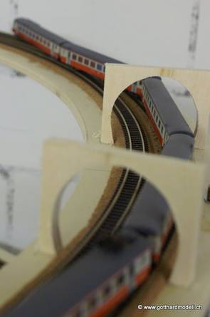 Die Strecke im Bereich Pfaffensprung bis Eggwald ist ja nun mittlerweile weit fortgeschritten. Jetzt folgen zum Teil Korrekturen basierend auf den Fahrtests und der Blockeinteilung. 01/01/10 Obere WattingerbrückeDie obere Wattingerbrücke «hing» bis anhin fast frei in der Luft, was sich auch in einem entsprechenden Gefällsbruch bemerkbar machte. Das neue Rollmaterial (IC 2000) erfordert es nun, dass die Strecke hier besser ausnivelliert wird; so wurde das Trasse im unteren Bereich zusätzlich abgestützt. 01/29/10 Kirche WassenErste Stellproben mit der Kirche von Wassen - wohin damit? Auf welche Höhe? Geplant ist, die Strassen mit Karton als Probemodell nachzubilden, damit die Verhältnisse und der Gesamteindruck beurteilt werden können.