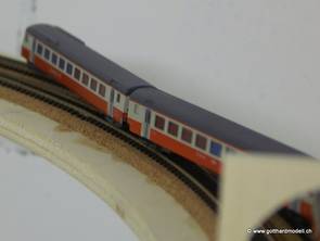 01/31/10 PfaffensprungstauseeDamit die Gegend um den Pfaffensprung realistisch beurteilt werden kann wurden nun, wie bereits erwähnt, auch die Strassen mit Karton nachgebildet - ebenso der Pfaffensprungstausee. Ein Beitrag im Loki 02/2010 mit der Abbildung einer Fussbodenschlucht hat mich auf die Idee gebracht, ebenfalls eine solche nachzubilden - der Pfaffensprungstausee eignet sich ausgezeichnet dazu, wie ein Originalbild zeigt. Die linke Flanke der Schlucht wird oberhalb des Stausees mit gleichem Winkel ansteigen und den Aufstieg zum Kirchberg darstellen, auf welchem die Kirche Wassen zu stehen kommt. Die Sustenpassstrasse wird wohl noch etwas korrigiert werden, bevor sie unter der mittleren Meienreussbrücke hindurch führt. 03/28/10 Obere Wattingerbrücke - der GleiswechselNachdem nun die Weichendecoder WA5 alle fertig zusammengelötet sind konnte heute der erste Gleiswechsel mit Servos und Decodern ausgerüstet werden. Die Peco-Weichenfedern wurden im Gegensatz zur ersten Anlage komplett entfernt. Somit sind die ersten zwei Weichen digitalisiert, was noch fehlt ist die Verkabelung. 04/04/10 Anschluss der WeichendecoderDie 04/05/10 Spurwechsel Eggwald ist Digital04/07/10 Servos so weit das Auge reicht ...Heute sind die bestellten Servos eingetroffen, so dass weitere Spurwechsel ausgerüstet werden können - leider befinden sich aber zwei Spurwechsel genau auf Brücken - nämlich die untere und die mittlere Meienreussbrücke, was den Servoeinbau genau unterhalb der Weiche verunmöglicht, da muss dann ein Bowdenzug her. 04/11/10 Verdrahtung der SpurwechselDie beiden Spurwechsel «Eggwald» und «obere Wattingerbrücke» wurden nun definitiv an die neue Ringleitung angeschlossen, dies beinhaltet die Ansteuerung der Servos, die Herzstückpolarisierung und die Einspeisung der im Spurwechsel liegenden (und durch die Trennstellen stromlosen) Schienenstränge. Da bei jedem Decoder je eine Weiche in einem anderen Boosterstromkreis liegt muss die Polarisierung dementsprechend ausgelegt sein, dass es später beim Auftrennen der Leitungen (im Moment sind die Boosterstromkreise «kurzgeschlossen») keinen Kurzschluss gibt. 04/18/10 Spurwechsel LeggisteinDieses Wochenende konnte der Spurwechsel Leggistein (welcher nur im Modell existiert!) mit Servos und Decodern ausgerüstet werden. Zum Einsatz kamen die «neuen» Servos von Conrad, welche ursprünglich einen guten Eindruck gemacht haben. Doch beim Betrieb stellte sich heraus, dass das Getriebe der Servos über ein zu grosses Spiel verfügt und das Servo in der Endstellung um einige Zehntel Millimeter zurückläuft, was dann an der Weichenzunge selber schon mal 0.5mm ausmachen kann - bei Spur N nicht tolerierbar. So werden diese Servos gegen die «altbewährten» Futaba S3003 ausgetauscht, welche zwar etwas teurer sind, dafür diese Mängel nicht aufweisen. 05/18/10 Neue Servos06/13/10 Umbau SpurwechselDer Spurwechsel im Leggisteintunnel wurde mit den neuen Futaba-Servos ausgerüstet und ist nun auch befahrbar. Nach neuesten Erkenntnissen waren nicht die Conrad-Servos an sich mangelhaft sondern das Aufsteckrad hat zu viel Spiel. 07/03/10 Entgleisung im Leggistein |
