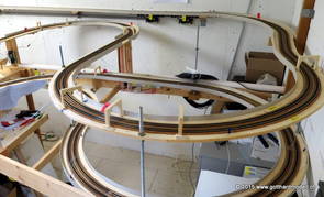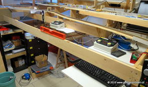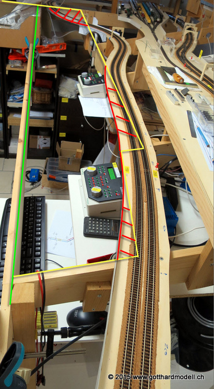 Die Strecke (Teil 7)11/01/15 Planänderung des GrundrahmensDa die "geschwungene" Strecke von der unteren Wattingerbrücke bis zum Pfaffensprung das "Lichtraumprofil" des Grundrahmens mehrmals überschreitet wird der Grundrahmen neu geradlinig ausgeführt, dies ermöglicht auch eine bessere Landschaftsgestaltung (abfallendes Gelände vom Bahntrassee bis zur Anlagenkante). 11/08/15 Änderung des Grundrahmens12/25/15 Schienen schweissen