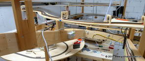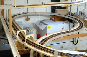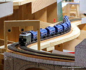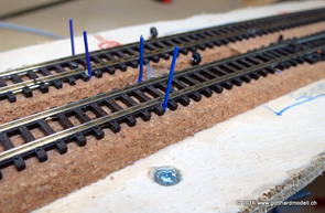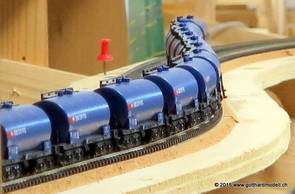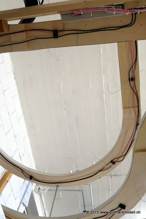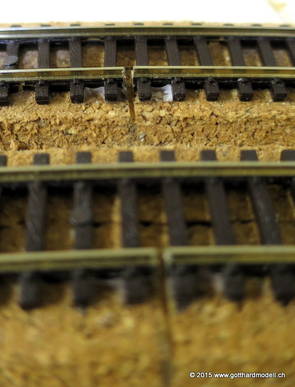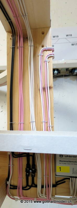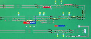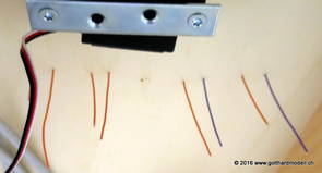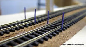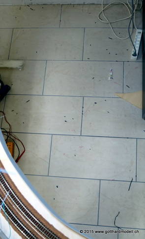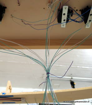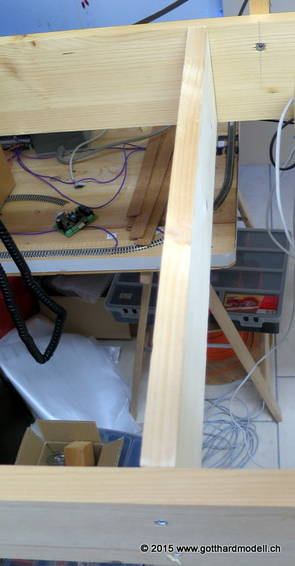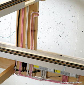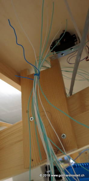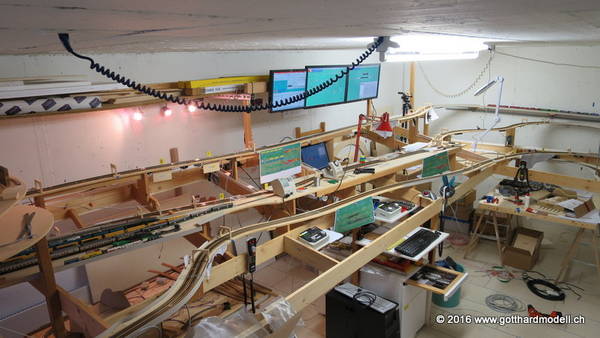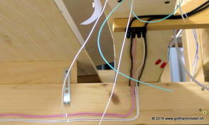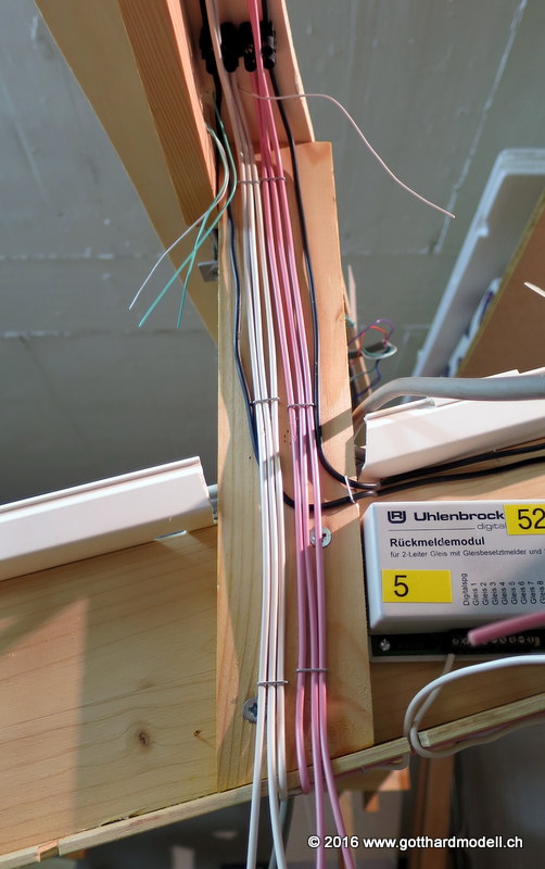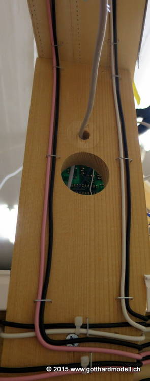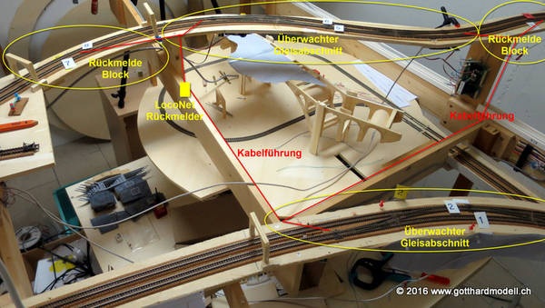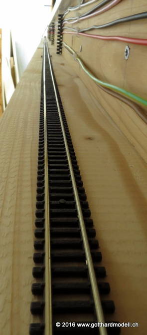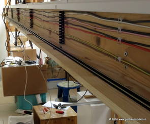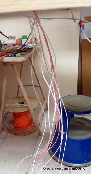 12/29/15 Grundverkabelung abgeschlossenDie Grundverkabelung im rechten Anlagenteil ist nun soweit abgeschlossen - jetzt werden noch alle Verbindungen mit dem Piepser getestet und dann ist es bald soweit - die Trennscheibe wird zum Einsatz kommen. Ach ja, fast vergessen: Da die Verkabelung hat doch einige Dutzend Meter erfordert hat ist der weisse Installationsdraht zur Neige gegangen - als ich heute Nachschub besorgen wollte musste ich mich eines Besseren belehren lassen - weiss gibt es nicht mehr; als Ersatzfarbe kommt nun hellgrau zum Einsatz. 12/30/15 VorbereitungsarbeitenBevor die Trennstellen für die Rückmelder erstellt werden können waren noch ein paar Vorbereitungsarbeiten nötig - die Kurvenüberhöhung in den sichtbaren Streckenabschnitten, fixieren der Schwellen links und rechts von der Trennstelle sowie Probefahrten. Wenn alles glatt läuft, können am letzten Tag ders Jahres (also morgen) die Schienen getrennt und die Rückmelder in Betrieb genommen und getestet werden. 12/31/15 Die TrennstellenNachdem alle Vorbereitungsarbeiten abgeschlossen werden konnten, ging es zur Sache - die mit der Trennscheibe. Das Trennen ging gut vonstatten, bei PECO-Gleisen muss darauf geachtet werden, dass die gesamte Schiene durchgetrennt wird, und da so tief geschnitten werden muss ist auf die daneben liegende Schiene zu achten, so dass diese unbeschädigt bleibt. Die Rückmelder für den rechten Anlagenteil sind nun alle betriebsbereit und wurden bereits in der Software eingetragen. 01/02/16 Der nächste Rückmelder01/02/16 Gleisanschlüsse für die RückmeldungFür die nächsten Rückmeldeblöcke werden wieder die benötigten Gleisanschlüsse angelötet - damit die Bohrungen anschliessend auch wieder gefunden werden, werden diese mit einem "Dummy-Kabel" markiert, bis die vorbereiteten Anschlusskabel eingesetzt werden können. Nicht unweit davon steht die nächste Signalbrücke - hier beobachtet mit einem neuen Signalbegriff - ich konnte es nicht lassen ;-) 01/03/16 Rückmeldung und EinmessstreckeDie gestern vorbereiteten Gleisanschlüsse wurden heute angelötet - jetzt fehlt noch die Verkabelung bis zum Rückmelder. Für den Bahnhof Wassen kommt ein Gestern wurde auch die Einmessstrecke vorbereitet - dass die Loks eingemessen sind ist unabdingbar wenn mit Rückmeldern gefahren (und vor allen angehalten) werden soll. Die Strecke besteht aus ganzen Peco-Flexgleisen à 970mm und auch aus 4 Rückmeldeabschnitten - so können über 3 Abschnitte (1 - 1 -1) einzelne Loks und über alle 4 Abschnitte (1 - 2 - 1) auch ganze Triebzüge eingemessen werden. 01/08/16 Weitere ArbeitenAuch die Abschnitte mit noch fehlender Kurvenüberhöhung wurden nun noch nachgerüstet und die LocoNet-Verkabelung (Ringleitung) wurde bei den bereits montierten Modulen angebracht. 01/24/16 Die RückmeldungDie ganze Anlage bzw. auch der Anlagenraum stehen unter dem Einfluss der Und so sieht es aktuell aus: 01/31/16 Die nächsten Rückmelder02/08/16 Die restlichen Leitungen folgen02/12/16 Wattinger und EggwaldDiese Abschnitte sind nun fertig "vergerückmeldet" und funktional - nur die Brems- und Haltemarkierungen in der Software stehen noch aus - dazu müssen die Abschnitte nochmals cm-genau vermessen werden. 02/16/16 Rückmeldung im Bahnhof WassenDie Rückmeldung im Bahnhof Wassen (notabene der letzte Abschnitt) wurde nun in Angriff genommen und die Positionen der Bohrungen genauestens kontrolliert, nicht dass ein Servo oder so angebohrt wird. Allein in diesem Abschnitt sind es 19 Rückmeldeabschnitte und da ich beschlossen habe, auch die Weichen zu überwachen kommen nochmals 4 Rückmelder dazu - das heisst, dass ein einfacher Bahnhof mit drei Strecken- und drei Abstellgleisen 23 Rückmelder und insgesamt 2x35 Einspeisepunkte benötigt - von wegen zwei Kabel ... 02/21/16 Der Bahnhof ist verkabeltHeute konnte die Verkabelung der Rückmelder im Bahnhof Wassen abgeschlossen werden - die 16 Rückmeldekabel an den Blücher GBM16X-8A sind allerdings noch provisorisch verlegt. Bei der ersten Inbetriebnahme des GBM16X-8A ist zudem noch Folgendes passiert - alle sich auf der Anlage befindlichen Loks haben begonnen, vor- und rückwärts zu fahren - das hat unheimlich getönt. Die Rückmeldung an sich hat aber anstandslos funktioniert - was war passiert? Irgendwo in den Tiefen der Bedienungsableitung steht, man müsse ein seperates Netzteil (nicht dasjenige, welches die Digitalzentrale mit Spannung versorgt) verwenden - da alle meine Tests mit nur einem Netzteil keine Probleme verursacht haben ging diese Info irgendwie vergessen ... Mit einem Nun fehlen noch die beiden Blöcke vor der Kehrschleife Eggwald und die Einmessstrecke - und eben diese Einmessstrecke wird jetzt dringend benötigt, damit die Software auch die Eigenschaften der Loks kennt und diese dann punktgenau steuern kann. Vor dem Einmessen werden dann auch noch die relevanten CV's aller Loks eingestellt; es sind dies vor allem: