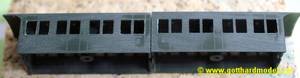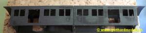 Dieser Wagen Die Gehäusehälften sind nun auch verspachtelt. In Bild 18 und 19 werden die Löcher 0.4mm für die Griffstangen in das Vordach gebohrt. Ganz unten ist eine erste Designstudie bezüglich der Form und Befestigung der Griffstangen - noch ein bisschen wacklig, aber so in der Art könnte es gehen. Ob die "alte" Plattform (vor der Stirnseitentüre) weiterverwendet werden soll ist noch ungewiss. |