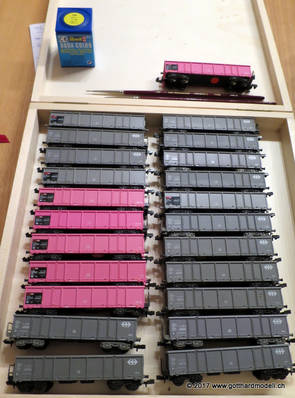Ladungsgüter für Eaos10/15/17 Was wird befördert?Ab Werk werden die meisten Eaos entweder mit Kohle oder gar nicht beladen - doch in der Schweiz und speziell am Gotthard wurde in den Achtzigern eigentlich nicht Kohle befördert - sondern meistens Alteisen, Glas, Aluminium, Baukeramik, Schutt, Aushubmaterial und weitere solche Güter. Ich habe die «Kohleeinsätze» nun abgeändert und mit diesen eher realistischen Gütern versehen - nebst dem «pimpen» (Aufstiegsgeländer und Anhebepunkte farblich bearbeiten) und «altern» der Wagen. |