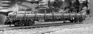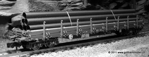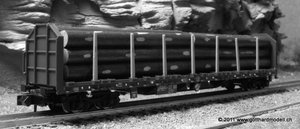Mit Langholz und Röhren durch Europa sausen: Vierachsiger Flachwagen mit festen Rungen (Sps/Snps). Speziell geeignet für unempfindliche Güter wie Stammholz, Industrieholz (Papierholz), Schnittholz (Bretter), Rohre, Stahl-Betonträger und Stahlmatten. Mindestlänge des Ladegutes: 3 Meter.