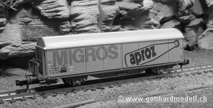 SBB Hbis-vxy Schiebewandwagen "Migros Aproz" | | | Betriebsnummer | | | Baujahr | | | Gewicht | | | Fassungsvermögen | | | Modell | Roco 25061 | | Dokumente | | Besonderes / Bemerkungen | |