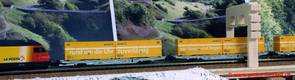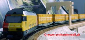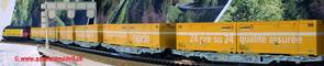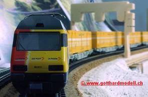 Behältertragwagen Schweizer Post - AAE LgnssSchnelle PostlogistikUm den schweizweiten Brief- und Paketversand schneller und letzlich auch wirtschaftlicher zu gestalten, investierte die Schweizer Post in den Aufbau einer Logistik, die den Wechselbehälter als tragendes Element vorsieht. Um auch die Eisenbahn in dieses System einzubeziehen und nicht – wie in vielen anderen Ländern geschehen – nahezu ausschliesslich auf die Strasse als Verkehrsträger zu setzen, musste ein geeigneter Tragwagen gefunden werden. Die Rollmaterialknappheit im Kombinierten Verkehr ist jedoch so alt wie der KV selbst. Zudem gab es Ende der 1990er Jahre kaum für das Anforderungsprofil geeignete Waggons. Immerhin sollten je Waggon zwei Behälter transportiert werden können. Vierachsige Waggons waren hierzu eindeutig überdimensioniert und wären durch viel ungenutzte Ladelänge sowie grosser «Totlast» unwirtschaftlich gewesen: Die meisten Vierachser sind ausgelegt für 60' Ladelänge und somit gut geeignet für ISO-Container – nicht jedoch Wechselbehälter, deren Längenmasse zwischen 23,5' (7,15m) und knapp 26' (7,82m) liegen. Zweiachsige Waggons jedoch wurden seit den 1980er Jahren europaweit praktisch nicht mehr neu gebaut, da sie für den Containertransport aufgrund der maximalen Achslast nur begrenzt nutzbar sind. Damit war klar, dass für den geplanten Einsatz nur eine Neukonstruktion in Frage kam. Der «Postwagen» LgnssDie Schweizer Post beauftragte die Ahaus-Alstätter-Eisenbahn (AAE) – einer der grössten Waggonvermieter Europas – mit Konstruktion und Lieferung eines geeigneten Waggons, der langfristig von ihr angemietet werden sollte. Die AAE liess daraufhin bei MSV (CZ) einen zweiachsigen Behältertragwagen bauen, der mit einem Radstand von 10m eine Ladelänge von 15m aufweist und somit geeignet ist für das geforderte Beladungsszenario von zwei 7,45m Wechselbehältern (C745). Die Ladeflächenhöhe liegt durchgehend bei 1.070mm über SO und unterschreitet somit die gemäss UIC-Merkblatt 571-4 (Einheitsgüterwagen – Güterwagen des kombinierten Verkehrs) vorgesehene Normalhöhe um 100mm. Folglich trägt der Waggon gemäss UIC 596-6 (Huckepackverkehr – Technische Organisation – Bedingungen für die Kodifizierung der Huckepackladeeinheiten und der Huckepackstrecken) die Kennzeichnung C+8 im Vereinbarungsrater und ermöglicht so den Transport auch höherer Ladeeinheiten auf Strecken mit begrenztem Profil. Bei einem Eigengewicht von 14t weist der »Postwagen« eine für den Einsatzzweck in der Brief- und Paketlogistik geeignete Lastgrenze von 26t (ss-Verkehre) resp. 31t (s) auf. Die Maximalmasse des Wagens liegt somit bei 45t – im Betrieb werden 31,6t als Normgewicht angesetzt (die Ladeinheiten werden im Post-Betrieb nicht verwogen!). Trotz zusätzlich an den Wagenenden eingebauter Schwingungsdämpfer, die Schwingungen der Waggonstruktur bei teilbeladenen Waggons verhindern sollen, verkehren die «Postwagen» entweder leer oder immer mit zwei Behältern beladen – selbst wenn einer davon leer mitgeführt wird. Inklusive drei Prototypen wurden 1999 ingesamt 253 Einheiten gebaut und bei der AAE in Dienst gestellt. Alle Einheiten sind lackiert in RAL 7044 seidengrau. Als zweiachsiger Tragwagen trägt der «Postwagen» die Bauartbezeichnung Lgnss und ist gemäss UIC 438-2 (Kennzeichnungen der Güterwagen) eingereiht als (43 68) 443 000 – 252. Text: Produkt Flyer CreaNorm. Wiedergabe mit freundlicher Genehmigung von CreaNorm. |