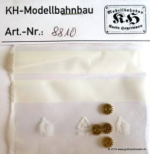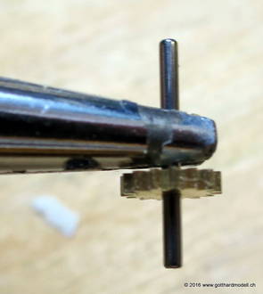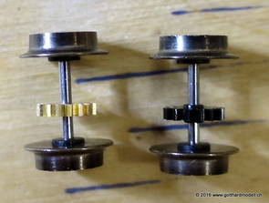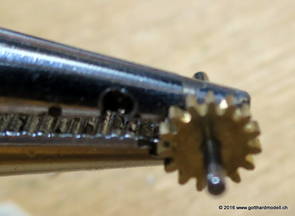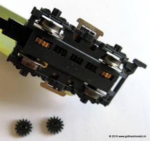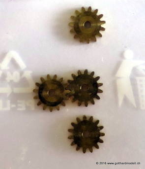 Unterhaltsarbeiten09/23/16 Haarrisse in den AntriebszahnrädernEin bekanntes Problem bei Arnold-Modellen sind die Haarrisse in den Antriebszahnrädern - ein rythmisches klackendes Geräusch, mit der Motordrehzahl synchron, deutet auf dieses Problem hin. Zu erkennen sind die Haarrisse (darum auch der Name) nur gegen das Licht mit einer entsprechenden Lupe. Betroffen sind meistens die Antriebszahnräder, bei welchen die Kunststoffzahnräder auf die Metallachse aufgepresst ist und mit der Zeit dem Pressdruck nachgeben und reissen. Hier hilft nur das Ersetzen der Zahnräder, am Besten durch Messingzahnräder mit Modul 0.3, 15 Zähnen, Innenbohrung 0.975 und 1mm breit - erhältlich z.B. bei KH-Modellbahnbau unter den Bestellnummern 8810, 8811 oder 8812 (2, 4 oder 6 Zahnräder). Vorgehen: