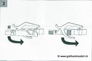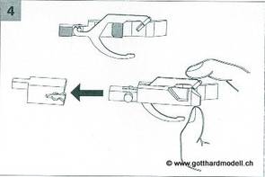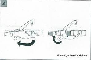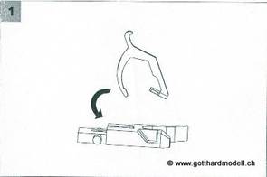 Damit der IC 2000 auch die Betriebsbewilligung auf der Gotthardnordrampe erhält, waren einige Modifikationen nötig, die ich hier näher beschreibe. DrehgestellblendenDie passgenauen Drehgestellblenden und der tiefliegende Wagenboden haben es in sich: Ist die Strecke nicht penibel genau verlegt (Schienenstösse, Übergangsbögen, Kurvenüberhöhung, Gefällsbrüche) neigen die Drehgestelle zu Entgleisungen bzw. der Wagenboden streift die Geleise, oder, wenn der Gefällsbruch zu stark ist, wird der Wagen angehoben. Als Gegenmassnahme habe ich bei allen Drehgestellen 0.3 - 0.45mm unterlegt und damit die Wagenkästen angehoben, dies erhöht den Spielraum der Blenden und vermindert das Aushebeln der Drehgestelle und die damit verbundene Entgleisung. Gleichzeitig wird auch das Auflaufen auf den Gleisen eliminiert. KupplungenAuch die Kupplungen, vor allem diejenige des AD (direkt hinter der Lok) hebt sich unter Last (und der Zug hat sein Gewicht!) an und die Zugtrennung ist da. Dem AD sind Unterlagsscheiben beigelegt, mit welchen die Kupplung der Lok angehoben werden kann, dies bedingt allerdings, dass immer dieselbe Zuglok verwendet wird. Da dies an der Nordrampe nicht der Fall ist habe ich die Kupplung des AD leicht modifiziert - andere Modellbahnkollegen lösen dies auch mittels «Rubberzement». Ich habe aus einem dünnen Draht (Rest eines Elektronikbauteiles, 0.3mm) eine «Vorrichtung» gebogen, welche verhindert, dass die Kupplung des AD nach oben ausweichen kann - funktioniert! Trotzdem kann «zerstörungsfrei» entkuppelt werden.