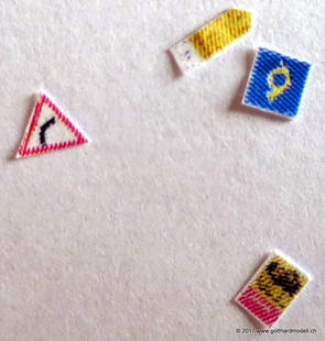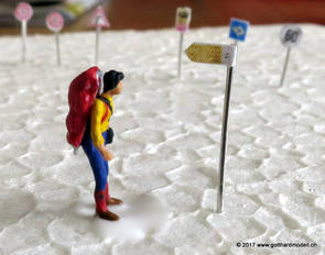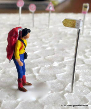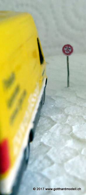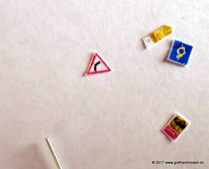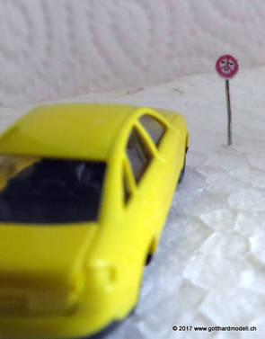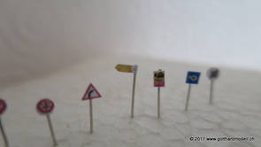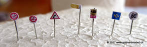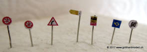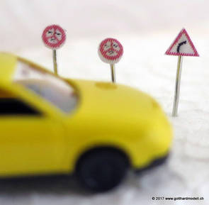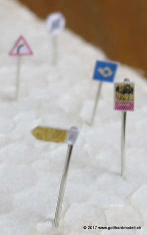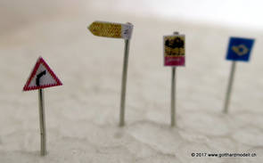 Schweizer Strassen und Velowege sind bekannt dafür, dass sie ausreichend beschildert sind - manchmal sogar etwas des Guten zuviel - so dass das Auf der Modellanlage hingegen bringen die Schilder keine Verunsicherung des Individualverkehrs und sind, sinnvoll eingesetzt, ein Blickfang auf jeder Anlage. GefahrensignaleHinweis: Nur registrierte Benutzer sehen die Verkehrsschilder in Originalgrösse und Farbe. HinweissignaleGebotssignaleVortrittssignaleDiverse Symbole02/07/17 Die ersten Schilder entstehenDa die Sustenpassstrasse auf der Anlage und die Bergstrasse auf dem Diorama am Entstehen sind, muss natürlich auch der Schilderwald her - Strassenschilder, Ortstafeln und Wanderwegweiser, um nur Einige zu nennen. Aus den Vorlagen habe ich die passenden Schilder auf 3- oder 4mm verkleinert, ausgedruckt (die Auflösung könnte noch etwas besser sein, mal einen anderen Drucker ausprobieren) und ausgeschnitten - was rund ist kommt in die Lochzange. Als Befestigungsstange dient ein abisolierter U72-Draht, der hat gerade 0.4mm Durchmesser und eignet sich bestens. Den Draht an der Spitze in einen Tropfen Weissleim stecken und mit der Pinzette das Schild befestigen - klappt! Und das sieht dann so aus: |