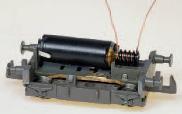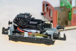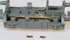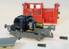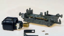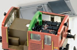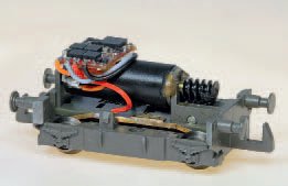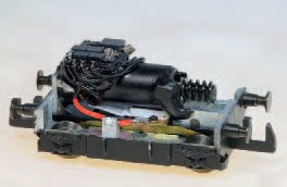 Als erstes wird das Kunststoffteil mit den Radschleifern mit etwas (!) Zweikomponentenkleber in das Chassis geklebt, früher wurde es durch den Motor nach unten gedrückt. Zuvor werden die beiden Kontaktfahnen, die den alten Motor mit Strom versorgt haben, etwas rabiat durch mehrmaliges Hin- und Herbiegen entfernt. Achten Sie bitte darauf, dass Sie nicht zu viel Klebstoff nehmen, es darf nichts in die Aussparungen für das Getriebe gelangen. Auf «wundersame Art und Weise» passt der neue Maxon-Motor mit etwas Spannung in die beiden Originalmotorhalter. Nachdem die Antriebsschnecke mit, dem Teilesatz beiliegenden Kupferdraht, umwickelt worden ist, sollten die Masse und der Einbauraum noch einmal sorgfältig überprüft werden. In unserem Fall musste der hintere Wellenstummel des Maxon-Motors etwas zurückgefeilt werden, er hätte sonst an der Gehäuserückwand gestreift. Nach dem Feilen gut reinigen! Danach wird der Motor in den Original-Motorhaltern eingeklebt, die Beschriftung des Motors ist dabei in Fahrtrichtung rechts. Der Kupferdraht sorgt während des Aushärtens des Klebers für das nötige Zahnspiel. Das ist sehr, sehr wichtig für den späteren ruhigen Lauf! Ist der Kleber trocken und ausgehärtet, wird der Kupferdraht vorsichtig entfernt. Das gelingt am besten, wenn er durch Drehen des Motors nach vorne «herausgeschraubt» wird. Bitte nicht einfach seitlich herausziehen, die filigrane Motorwelle könnte verbogen werden! Anschliessend kommen die beiden Antriebsachsen und die vier Getriebezahnräder sowie die Getriebeabdeckung wieder an ihren Platz zurück. Mit provisorisch am Motor angelöteten Litzen kann der Motor ein erstes Mal in Betrieb gesetzt werden. Der leichte, vibrationsarme Lauf wird so überprüft. Halten Sie die Getriebeabdeckung dabei fest, hier leisten zwei «Krokodilklemmen» wertvolle Hilfe. Wir haben anschliessend den Decoder mit etwas Knetmasse so auf dem Motor befestigt, dass er im Bereich des Führerhauses zu liegen kommt. Motor und Decoder werden nun verdrahtet. Der rote Draht des Decoders kommt an den Radschleifer für die rechte Schiene, der schwarze an den für die linke. Am besten werden die beiden Decoderlitzen im Bereich der früheren Kontaktteile zum alten Motor angelötet, dort sind sie später nicht im Weg und behindern den Federweg der Radschleifer nicht. Die graue- und rosafarbene Litze kommen an den Motor. Die gelbe und die weisse Litze sind für die Beleuchtung und werden somit für den TmII nicht benötigt, so am besten direkt am Decoder ablöten. Der DCX76 lässt von Haus aus keinen Analogbetrieb zu. Darum muss ein erster «Bewegungstest» direkt am digitalen Stromkreis gemacht werden, die werksseitige Adresse ist die übliche «Drei». Erwarten Sie hier bitte nicht zu viel, da das Gewicht des Metallgehäuses in diesem Stadium noch fehlt. Es kommt fast zwangsläufig zu kontaktbedingten «Aussetzern». Dieser erste Test soll ja nur aufzeigen, ob mechanisch und elektrisch tendenziell alles im grünen Bereich ist.
