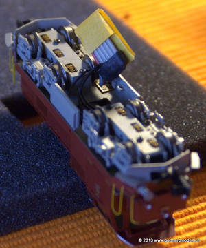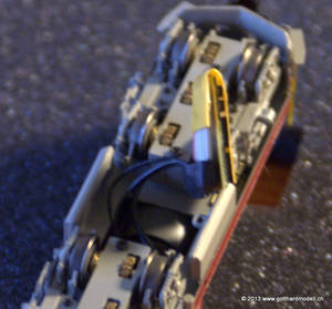 DecodereinbauEinbau Trix 66838 Decoder in Lematec Bm4/4Dieses Modell besitzt gemäss Datenblatt eine Schnittstelle nach NEM651 - und zwar unten zwischen den Druckluftbehältern. Zum Lösen der Schraube ist ein extrem kleiner Kreuzschraubendreher (und nicht Schlitz wie im Datenblatt «ersichtlich») nötig. Nach einigem Überlegen hat sich dann aber doch eine Lösung ergeben - die Anschlussdrähte des Trix-Decoders werden um 180° gebogen und um den Decoder herum geführt; und siehe da: passt! Mit eingebautem Decoder läuft das Modell noch feiner und leiser als im Analog-Betrieb; selbst mit Fahrstufe 1 ist es ein Genuss, dem Modell zuzusehen! Die Rückseite des Decoders muss isoliert werden, da die Anschlussdrähte um 180° gebogen und genau auf der Rückseite zu liegen kommen. Die Anschlussdrähte sind genau so lang wie der Decoder und die letzten 4mm werden abisoliert. Auch an der Aussenseite werden die Anschlussdrähte isoliert (gegen den Druckluftbehälter). |