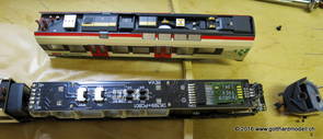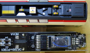 DecodereinbauEinbau ESU Lokpilot V4 micro DCC Decoder in Liliput RABe 521Auch dieses Modell besitzt bereits eine Schnittstelle nach NEM651, jedoch 8-polig! Die beiden äusseren Pin's werden nur im Analog-Modus benutzt, der Digital-Decoder muss «in der Mitte» eingesteckt werden. Der Einbau selbst ist ein Kinderspiel und ist (Einbaurichtung des Decoders beachten!) in 5 Minuten erledigt. Zum Abnehmen des Gehäuses muss die Schraube auf der Unterseite des Führerstandes der 2. Klasse (Einheit A, diese besitzt auf dem Dach ein "silbriges" Quadrat) entfernt werden, danach wird der Führerstand in Fahrtrichtung weggezogen. Die Rückseite des Führerstandes nimmt man besser auch gleich weg. Jetzt wird das Gehäuse durch vorsichtiges Spreizen nach oben entfernt und die Schnittstelle wird sichtbar. |