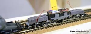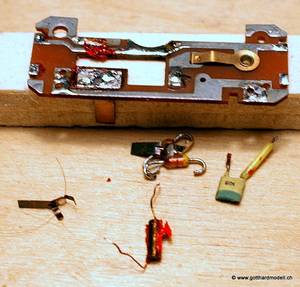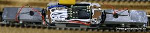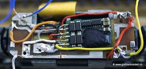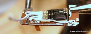 DecodereinbauEinbau Trix 66838 Decoder in Minitrix 12926Dieses «alte» Minitrix Modell verfügt über keine Schnittstelle - doch laut einer Anleitung, die ich im Internet gefunden habe, müsste der Trix Decoder 66838 nach dem Entfernen der alten Platine Platz finden. Also nichts wie los! Die Lichtkabel sind natürlich genau verkehrt herum angelötet - dank der Funktion «Lichtumpolung» des Decoders (CV51) muss ich die Kabel nicht umlöten. Allerdings scheinen die Glühlampen die Lichtausgänge des Decoders zu überlasten - die Überlastsicherung spricht an. Eventuell kommen hier LED's zum Einsatz - mal sehen. Wie könnte es anders sein - alles hat sich gegen mich verschworen! Die Lampen überlasten den Decoder - aber nur, wenn sie eingebaut sind. Werden die Lampen mit zwei einzelnen Drähten angeschlossen, geht es. Also anstelle des Masseanschlusses über das Gehäuse einen zusätzlich Draht verwenden - denkste, gleiche Probleme wie am Anfang. Lampen komplett demontieren, aber was ist denn jetzt? Die Lok stottert nur noch, bewegt sich ein paar Zentimeter und aus, fertig, Stillstand. |