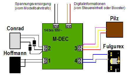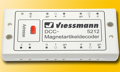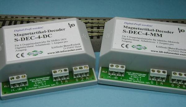 Hier gibt es drei Decodertypen zu unterscheiden - die Magnetartikeldecoder, welche für Weichen mit Magnetspulen verwendet werden, Motorweichendecoder für Fulgurex-, Lemaco- und Tortoise-Antriebe sowie Servodecoder - siehe dazu Zubehördecoder als WeichendecoderZunehmend übernehmen sogenannte «Zubehördecoder» die Funktion von reinen «Weichendecodern» - bei diesem Decodertyp können alle Ausgänge genutzt werden (bei reinen Weichendecodern bleiben oft nicht genutzte Ausgänge «überflüssig» und liegen brach), dies auch im Mischbetrieb zusammen mit Signalen. Zudem sind die Ausgänge alle einzeln konfigurierbar (Ausgangspannung, Moment- oder Dauerausgang, Auf- und Abblenden u.v.m.) und decken damit das ganze Spektrum ab. Den von mir bevorzugten Zubehördecoder findest Du hier MagnetartikeldecoderMit diesen Decodern können Magnetdoppelspulenantriebe wie diejenigen von Minitrix, Arnold, Fleischmann, Roco & Co. angetrieben werden; auch Entkupplungsgleise benötigen meistens diesen Decoder. Hierbei wird ein kurzer Stromimpuls auf den jeweiligen Ausgang gegeben, welcher die Magnetspule in die andere Position bringt. Die Impulsdauer ist meist einstellbar, um ein Durchbrennen der Antriebe zu verhindern.