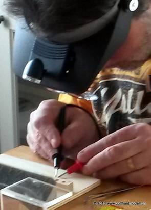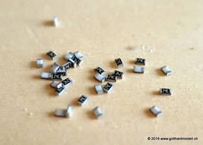 Ich habe durchgängig die Variante mit drei Rückmeldern pro Block angewandt, Spurwechsel werden ebenfalls überwacht, damit belegte Weichen nicht unter dem fahrenden Zug gestellt werden können. 02/27/16 Rückmeldung von WagenDie Rückmeldung basiert darauf, dass ein "Verbraucher" auf dem entsprechenden Streckenabschnitt detektiert werden kann - dies sind bei 2-Leiter Bahnen im Normalfall Lokomotiven (Motor) und beleuchtete Wagen (Lampen, LED's). Andere Wagen hingegen erzeugen keine Rückmeldung und werden vom System normalerweise nicht erkannt. Für die computergesteuerte Zugsteuerung ist aber eine lückenlose Überwachung nötig, d.h. der gesamte Zug (also mit allen Wagen) muss erkannt werden, ansonsten besteht die Gefahr, dass der Zugschluss noch in einem anderen Block stehen bleibt, welcher aber als frei gemeldet wird, oder Weichenstrassen werden unter dem fahrenden Zug gestellt, da das System nur die Lok, welche die Weichen schon lange passiert hat, detektiert hat. Wagen können mit sogenannten Widerstandsachsen ausgerüstet werden, welche einen Verbraucher darstellen und so vom System erkannt werden. Der Verbraucher ist in diesem Fall ein Widerstand von 17.4kΩ, welcher auf das isolierte Rad geklebt wird; mit Silberleitlack werden die beiden Enden des Widerstands mit dem Rad und der Achse verbunden. Da der Widerstand relativ kleine Aussenmasse hat (1.6x0.8x0.45mm, geht aber bei Spur N nicht grösser) ist die Sache etwas fummlig und nur mit Pinzette und Lupe sicher zu bewerkstelligen. Hinweis: Wird ein Widerstand verwendet hat man einen definierten Widerstand; nur Silberleitlack geht auch, nur muss dann bei dieser Methode mit der Schichtdicke gearbeitet werden, welche die Leitfähigkeit bestimmt - im schlimmsten Fall produziert man einen Kurzschluss oder es fliessen so hohe Ströme, dass die Achse oder auch der Wagen "abgefackelt" wird. Verwendetes Material: