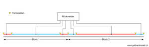 10/09/16 Und wo braucht es einen Rückmelder?Eigentlich sollte eine digitale Anlage lückenlos überwacht werden können - nur so weiss die Steuerungssoftware, wo sich welcher Zug befindet. Damit eine Zugverfolgung realisiert werden kann, ist es notwendig, jeweils eine Schiene beidseitig zu trennen und diesen isolierten Streckenabschnitt durch einen Rückmelder mit Strom zu versorgen. Jeder Verbraucher (Loks, beleuchtete Wagen usw.) in diesem Abschnitt wird dann durch den Rückmelder erkannt und der Software gemeldet. Durch das Einteilen der Strecke in sogenannte "Streckenblöcke" wird zum voraus festgelegt, wo die Trennstellen zu liegen kommen. Ein Streckenblock ist bei der grossen Bahn normalerweise dort, wo ein ganzer Zug angehalten werden muss und durch geeignete Signale geschützt ist - bei der Modellbahn ist dies normalerweise zwischen den Hauptsignalen. Wieviele Rückmelder brauch ein Block? Hier gibt es unterschiedliche Vorgehensweisen:
