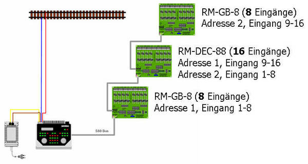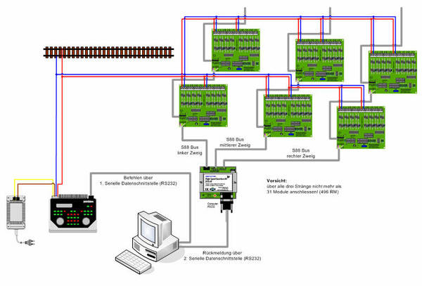 ist eines der ältesten Rückmeldesysteme und wurde erstmals beim Märklin Digitalsystem verwendet. Technisch ist es sehr einfach aufgebaut und wurde daher von vielen Herstellern entwickelt, was zu einem hohen Verbreitungsgrad und dementsprechend günstigen Preisen geführt hat. Praktisch alle auf dem Markt erhältlichen Digitalzentralen unterstützen den s88-Bus. Durch den einfachen technischen Aufbau ist dieses Bussystem leider relativ störanfällig; dies kann vom "Flackern1" der Rückmeldung bis zum Nichtanzeigen führen. Doch was ist die Ursache? Eine der wichtigsten Vorsorgemassnahmen ist die Busleitung selbst. Hier empfiehlt es sich, ein abgeschirmtes Kabel, bei welchem auch die Adernpaare selbst noch verdrillt sind, zu verwenden. Dazu bieten sich Netzwerkkabel2, wie sie in der Computerwelt verwendet werden, an. Diese bekommt man in jedem Computershop; sie sind zwar, je nach Länge, nicht gerade billig, aber den Ärger, den man sich ersparen kann, wiegen sie allemal wieder auf. Zu beachten ist beim s88-Bus die "Adressierung". Die Rückmeldebausteine, welche meistens als 8- oder 16fach Rückmelder erhältlich sind, müssen nicht "konfiguriert" werden - aber wie weiss dann die Steuerungssoftware, welcher Eingang eines Rückmelder jetzt angesprochen hat? ![]() Bei den gelb markierten Stellen ist also beim Definieren in der Steuerungssoftware Vorsicht geboten; am Besten erstellt man sich eine tabellarische Auflistung bevor die Einstellungen vorgenommen werden - oder, in Kenntnis der möglichen Stolpersteine werden "nur" ganze 16er Blöcke gebildet - also wenn schon 8er Rückmelder dann gleich zwei hintereinander, damit es wieder 16 ergibt. Beim s88-Bus (daher ja auch der Name Bus) gibt es genau eine Ringleitung von Rückmelder zu Rückmelder - was also tun, wenn in zwei Richtungen Rückmelder benötigt werden? Eine Variante wäre, den Bus einmal um die Anlage kreisen zu lassen - was aber lange Wege ergeben kann. Elegantere Lösungen erhält man unter Verwendung von LDT-Produkten wie HSI88 (von einem Punkt können drei s88-Busse weggeführt werden) oder der Datenweiche DSW88. Detaillierte Informationen zu diesen Produkten und deren Anwendung findest Du auf der Homepage des Herstellers. Wohin mit den s88-Rückmeldern? Diese Frage beschäftigt wohl viele Modellbahner: Die einen schwören auf eine zentrale Lage in der Nähe der Digitalzentrale, was kurze Busleitungen bringt - aber die Verbindung zum überwachten Block wird dementsprechend länger. Und die anderen platzieren die Rückmelder dezentral, also dort wo sie gebraucht werden; dies führt zu langen Busleitungen, aber im Gegenzug zu kurzen Verbindungen zum Gleis. Ach ja, fast vergessen: Egal, wie Du die s88 Rückmelder auch anschliesst - es sind maximal 31 16er Rückmelder zulässig, was 496 Eingänge ergibt. Einen ausgezeichneten Artikel zum Thema s88 findest Du auf der Homepage von Und hier noch ein paar Beispiele aus dem Digital Grundlagenkurs zum Thema s88: Zentrale, Trafo und s88-RückmelderZentrale, Trafo und s88-Rückmelder am HSI88 angeschlossen![]() 8er und 16er Rückmelder gemischt![]() 1 Einige oder alle Rückmelder zeigen Belegtzustand an, ohne dass sich ein Fahrzeug auf diesem Block befindet |