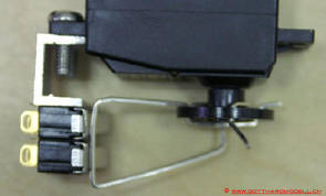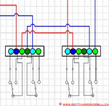 Mögliche LösungDie gelben und orangen Bereiche im Innenteil der Weiche können über die vorhandenen Anschlussdrähte fix verdrahtet werden, da sie immer, ungeachtet des Fahrweges, die gleiche Polarität benötigen und auch keinen Kurzschluss verursachen können. Die grünen Bereiche (hell- und dunkelgrün; Weichenzungen) stellen eigentlich auch kein besonderes Problem dar; sie können entweder über die anliegenden Weichenzungen am Aussengleis oder, und dies ist die sicherere Methode, über die Polarisationsrelais auf dem Weichendecoder mit der richtigen Polarität versorgt werden. Kniffliger wird hingegen der Anschluss der beiden roten, gelb umrandeten Schienenbereiche: Eigentlich wäre eine Spannungsversorgung über die Polaritätssteuerung der Weichenzungen der diagonal gegenüberliegenden Weiche möglich, da diese die gleiche Polarität aufweist; problematisch wird’s aber mit dieser Lösung, wenn alle vier Weichen auf Ablenkung sind. Aus diesen Gründen sollte die Spannungsversorgung dieser Bereiche über gesonderte Schalter erfolgen, und zwar so, dass die Polarität auch beim Schalten von Hand (also ohne Steuerungssoftware; „nur“ mit dem Digitalsystem) korrekt ist und kein Kurzschluss produziert wird. Die beiden dunkelroten, "kurzschlussträchtigen" Bereiche werden über zusätzliche Microschalter, welche direkt durch das Servo betätigt werden, mit der richtigen, dem Fahrweg entsprechenden Polarität versorgt. Ist ein „ungültiger“ Fahrweg eingestellt (alle vier Weichen auf Ablenkung) sind die roten Schienenbereiche spannungslos. Hier sind zwei einpolige Umschalter verwendet; ebenso kann ein doppelpoliger Umschalter zum Einsatz kommen, alle vier Servos werden so ausgerüstet
