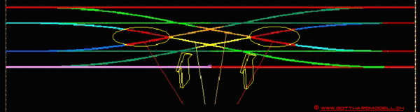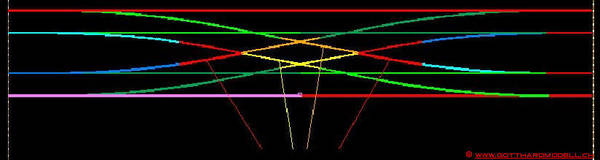 Komplizierter wird es da mit den gelb umrandeten, roten Schienenbereichen (Bild 3): Diese können nicht einfach nur mit „Saft“ versorgt werden; sondern müssen aufgrund der Weichenstellungen mit der richtigen Polarität versorgt werden. Erschwerend kommt noch hinzu, dass bei einem „ungültigen“ Fahrweg (beide linken oder beide rechten oder alle vier Weichen auf Ablenkung) ein Kurzschluss entsteht.