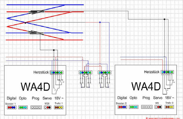 Gesamthaft werden 4 Decoder WA4D, 4 Servos und vier doppelpolige (oder 8 einpolige) Umschalter benötigt; verwendet man die neuen WA5D Decoder werden nur zwei Decoder benötigt. |