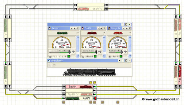 09/06/09 Optimierte Version zum DownloadDamit Du Dir selber ein Bild vom Linksverkehr machen kannst stelle ich Dir hier die Dateien zum Download zur Verfügung. Die Loks befinden sich in der Startposition. Starte als Erstes mittels des blauen Tasters eine Güterzugfahrt, wenn die Ae6/6 sich in Block 1 oder 3 befindet kannst Du den Personenzug (grüner Taster) hinterher schicken. Die Zugfahrten versuchen während 60s zu starten und sind als Kreisfahrten mit 20 Runden definiert. Der rote Taster STOP beendet alle Zugfahrten und hebt alle Blocksperren auf.