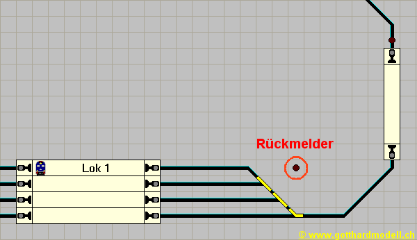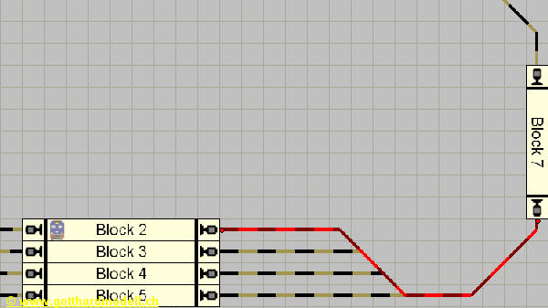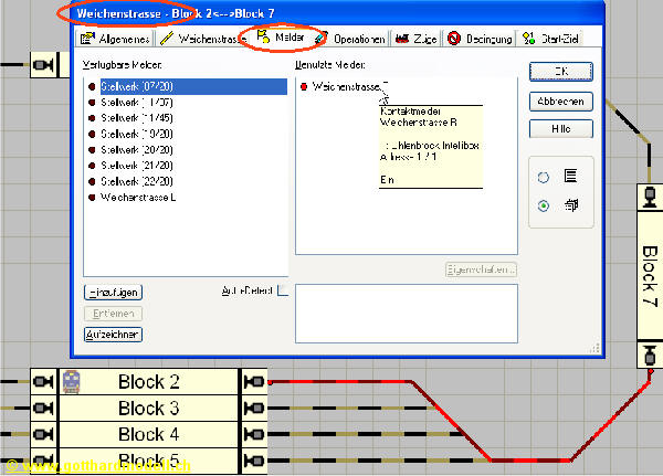 Bei TrainController werden ein oder mehrere Rückmelder zu Blöcken verknüpft, die dann der Rückmeldung der Lok- und Zugpositionen zum Computer dienen. Weichen oder auch Weichenstrassen können nicht in einem Block erfasst werden; doch genau diese haben die Tendenz, dass eine Lok stecken bleibt oder ein Wagen abgehängt wird. Dies führt dann meistens zu unschönen Auffahrunfällen, wenn der nächste Zug naht ... Wie kann also auch eine Weichenstrasse aktiv in die Zugverfolgung miteinbezogen werden? Zunächst sollten alle benachbarten Blöcke definiert und mit Rückmeldern versehen werden; elektrische Trennung natürlich auch. Damit die Weichenbelegtmeldung verwendet werden kann müssen diese auch elektrisch getrennt sein; am einfachsten ist dies bei Bau zu realisieren (ist ja klar). Viel Arbeit kann man sich ersparen, wenn man dies von Anfang an vorsieht, auch wenn im Moment noch kein Gebrauch davon gemacht werden soll - dann werden die Trennstellen einfach überbrückt. Sind diese Vorarbeiten erledigt kann es zur Sache gehen: Pro überwachte Weichenstrasse wird ein Rückmelder benötigt Und jetzt wird der Rückmelder den Weichen zugeordnet - aber wie? Den Weichen kann kein Melder hinzugefügt werden? Überhaupt, normalerweise kann ein Melder genau einem Block hinzugefügt werden (also eine 1:1 Beziehung), aber hier in diesem Beispiel wäre doch eine 1:3 Beziehung (1 Melder - 3 Weichen) nötig? Des Rätsels Lösung - der Melder wird nicht den Weichen, sondern den Weichenstrassen hinzugefügt. Dazu muss im Fahrdienstleiter die Blockansicht aktiviert und die entsprechende Weichenstrasse markiert werden und jetzt werden die Eigenschaften dieser Weichenstrasse benötigt - ein Doppelklick auf die rot markierte Weichenstrasse (oder CTRL-W) und das Eigenschaftsfenster öffnet sich und hier kann jetzt im Reiter "Melder" der entsprechende Melder hinzugefügt werden - dies ist für alle 4 Weichenstrassen, welche die drei Weichen benutzen, auszuführen.