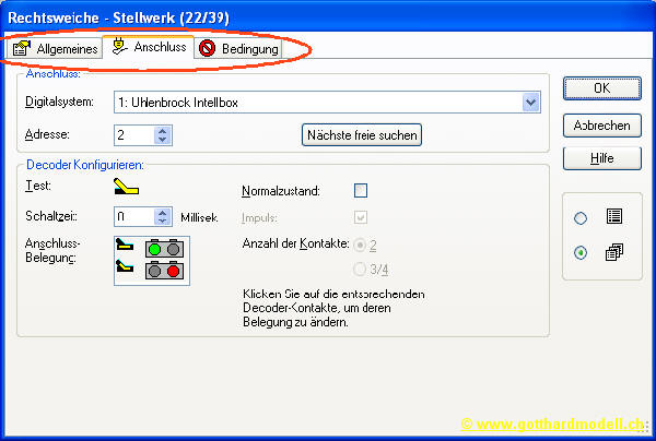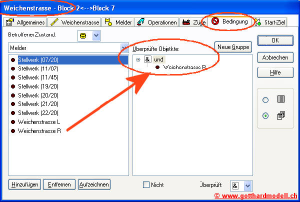 War das schon alles? Nein! Wir haben jetzt zwar die Überwachung realisiert, was aber noch fehlt ist die Bedingung, dass diese Weichenstrassen nur benutzt werden dürfen, wenn sie auch wirklich frei sind - dies wird im selben Fenster im Reiter "Bedingung" eingestellt So, das war's - jetzt gehören nicht überwachte Weichenstrassen und Auffahrkollisionen der Vergangenheit an - oder? Damit Du das Ganze selber ausprobieren kannst sind hier die Beispieldateien zum Download abgelegt: |