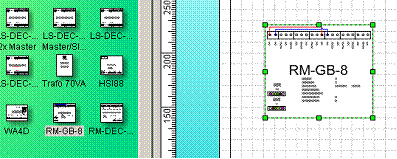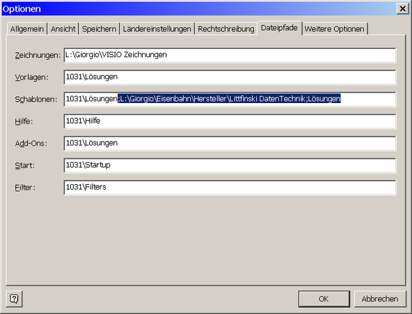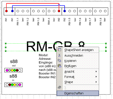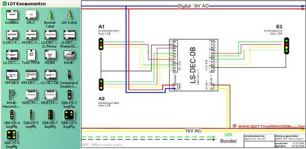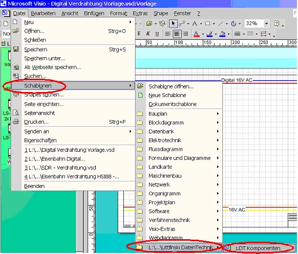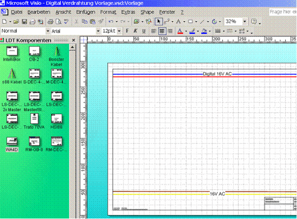 Um eine sinnvolle und aktuelle Dokumentation meiner Verdrahtung erstellen zu können (man erinnere sich: Digital gleich zwei Drähte ;-) ) habe ich auf der Basis von Visio eine Vorlage erstellt, die die von mir verwendeten Digitalkomponenten enthält und von Zeit zu Zeit oder auf Wunsch erweitert wird. Bei den Decodern und Rückmeldern können die Adressen eingegeben werden und die entsprechenden Ausgänge werden dann berechnet; dies ist dann bei der Eingabe in die Steuersoftware ungemein nützlich, da dort all diese Angaben benötigt werden. Damit Du siehst, wie das Ganze funktioniert ist hier die Gebrauchsanleitung: InstallationDie Datei „Digital Verdrahtung Vorlage.vsd“ in ein beliebiges Verzeichnis kopieren. Die Datei „LDT Komponenten.vss“ in das Standard Schablonen Verzeichnis von Visio (meistens „C:\Programme\Microsoft Office\Visio10\1031\Lösungen“) oder in ein anderes beliebiges Verzeichnis, welches in Visio unter Extras – Optionen - Dateipfade genau wie im Beispiel einzutragen ist. ![]() BenutzungNach dem Starten von Visio sollte in etwa folgendes Bild zu sehen sein ![]() wenn nicht, müssen die Visio Schablonen ausgewählt werden ![]() Jetzt kann eine Schablone aus dem linken Baum durch Ziehen in die Arbeitsfläche geholt werden ![]() Hier (dies gilt für alle Schablonen) können die Eigenschaften angegeben werden: Durch Klicken auf den fetten Text in der Mitte ![]() und anschliessendem Rechtsklick werden die Eigenschaften ausgewählt ![]() und definiert. Modul: ist die Angabe, das wievielte Modul in der s88 Bus Reihenfolge es ist (wird zur Berechnung der Adresse und der Nummerierung der Eingänge verwendet) ![]() Shapes und BeispieleDie unten abgebildeten Decoder befinden sich aktuell in der Vorlage