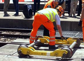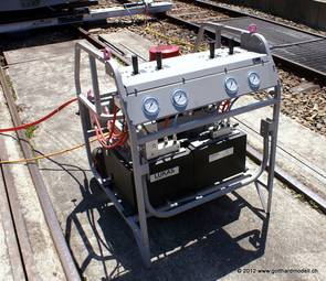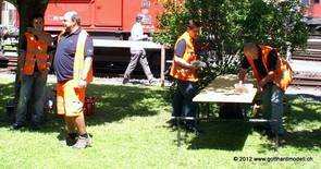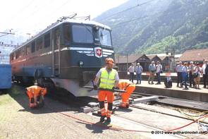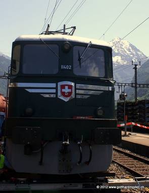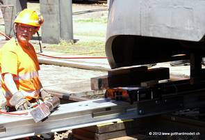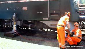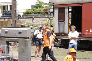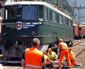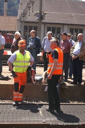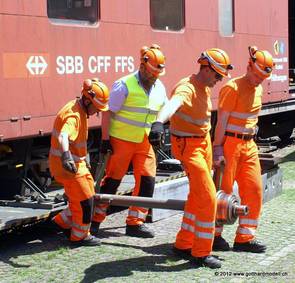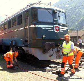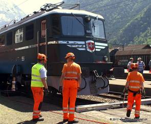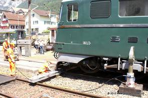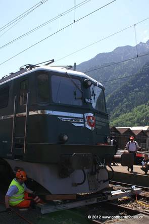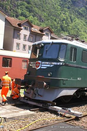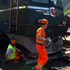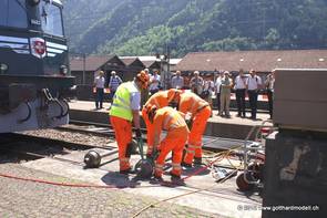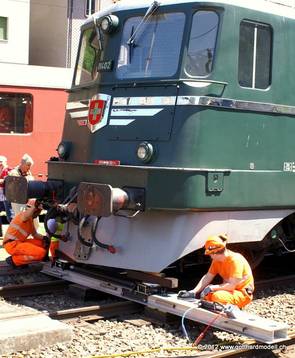 Nach dem Mittagessen (wie immer im Frohsinn) wurde dann durch das EIZ am Objekt (Ae6/6 11402, Uri-Stier) demonstriert, wie eine aus den Schienen geratene Lok wieder aufgegleist wird - immerhin 120t, die da bewegt werden müssen.